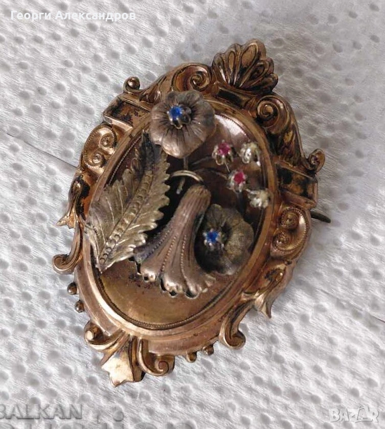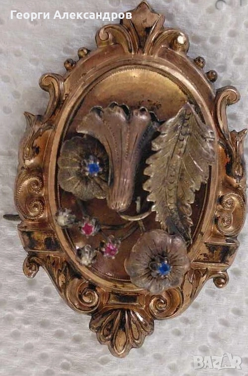 В много добро за годините си 100% автентично състояние - снимките я онагледяват. С инкрустирани 2 сини, 2 червени ръчно ювелирно фасетирани камъка и 2 миниатюрни перли - БЕЗ липси! Майсторска оригинална стара изцяло ръчна куха олекотена фина изработка. Реална и дебела позлата, запазена! Нужда от лека реставрация отзад - ченгелчето за закопчаването на иглата е отчупено, иначе ушенцето горе за окачването като медальон е ОК. КОЛЕКЦИОНЕРСКО попадение за ценители и познавачи! 5см. на 3см. Магнит НЕ я лови! Изпращам само по Еконт с Преглед и отстъпка-транспорт.