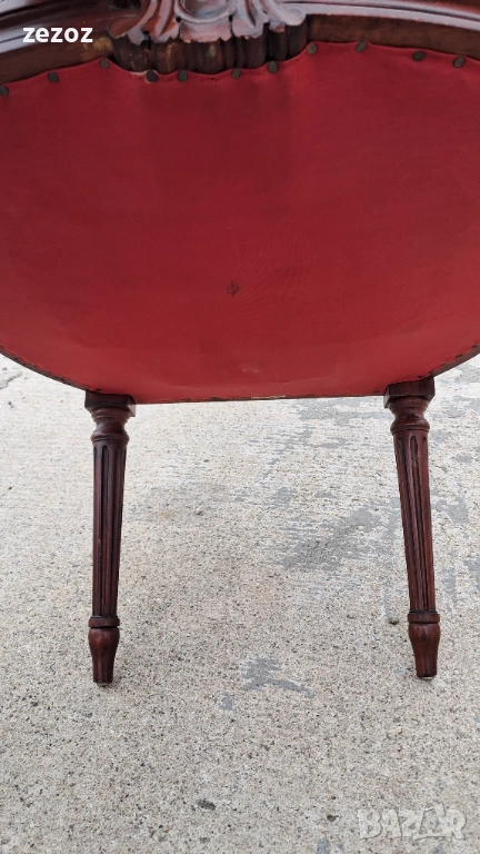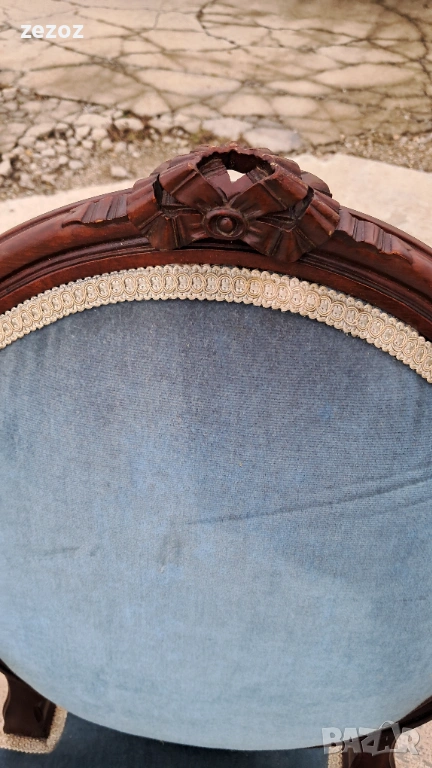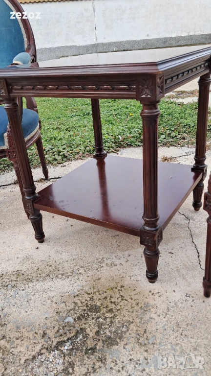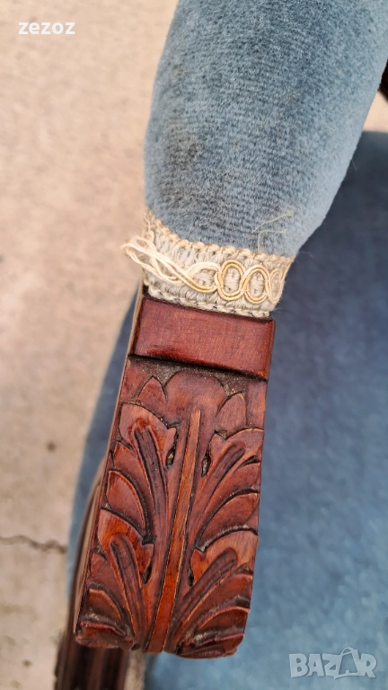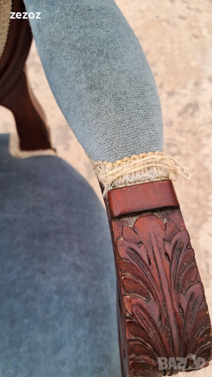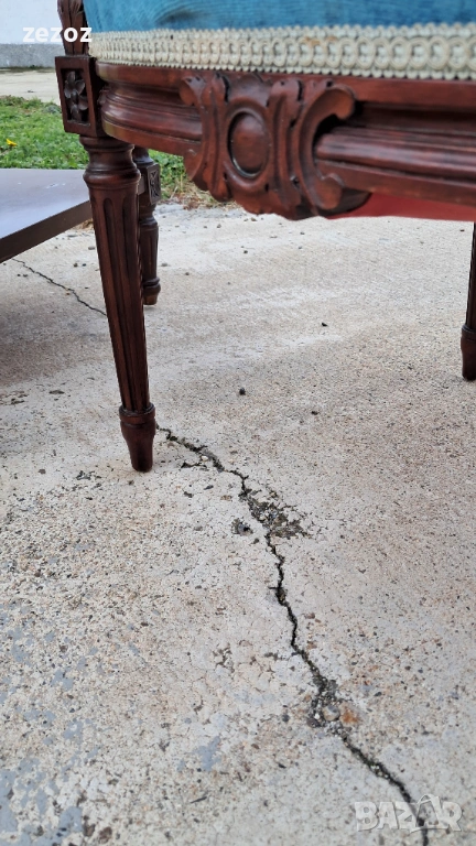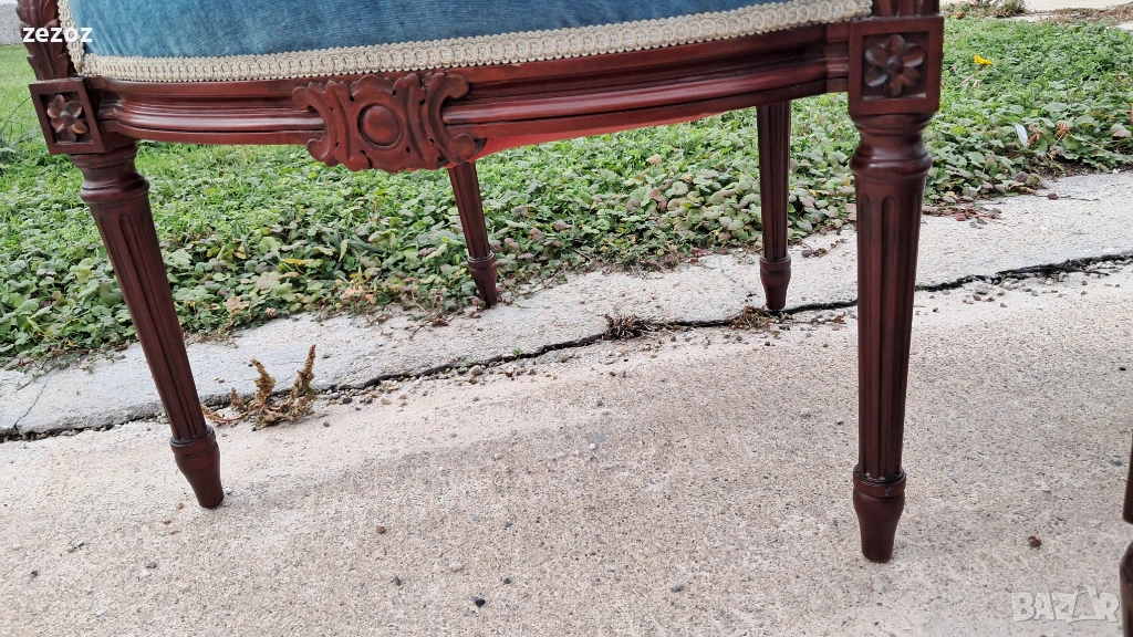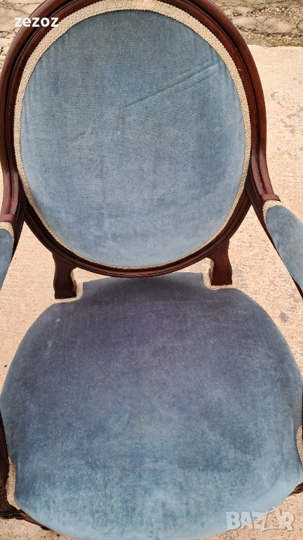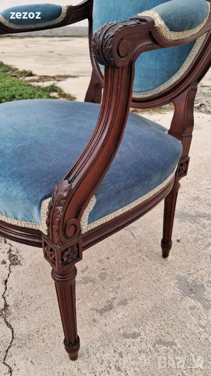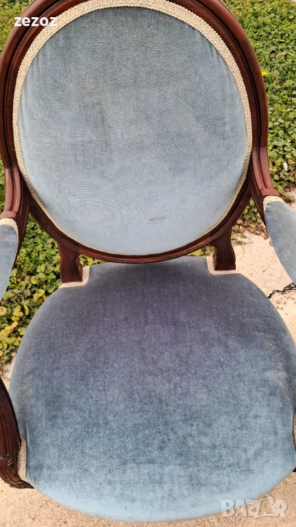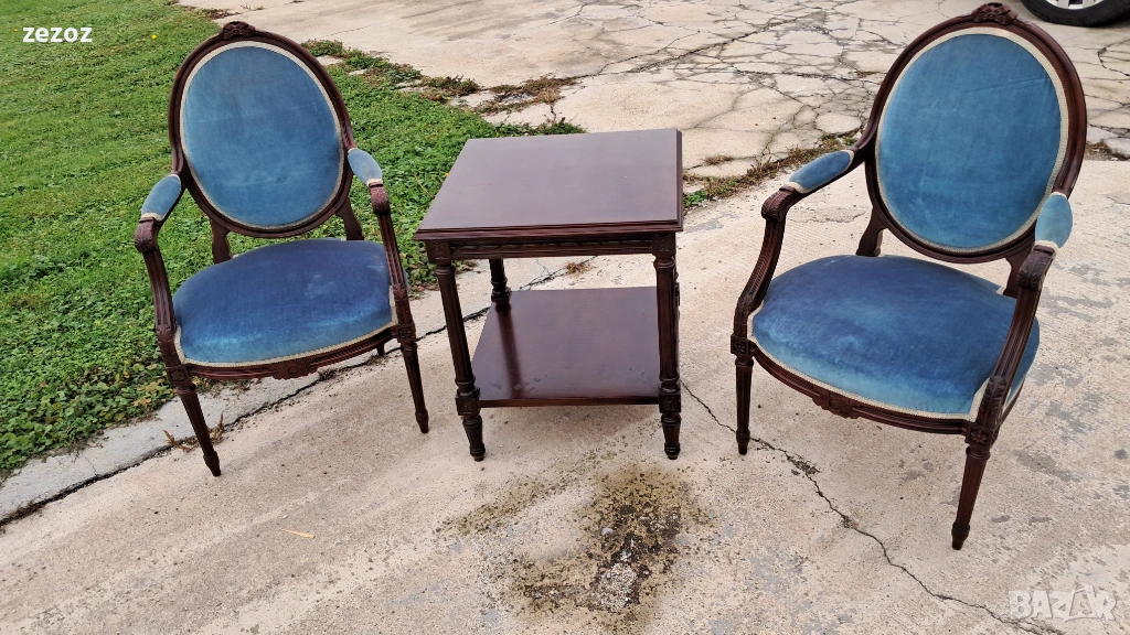 Комплект кресла и масичка във френски стил.Креслата са по- компактни и ниски.Конструктивно здрави със запазена синя плюшена дамаска.Старата система на седалките-ремъци и пружини.