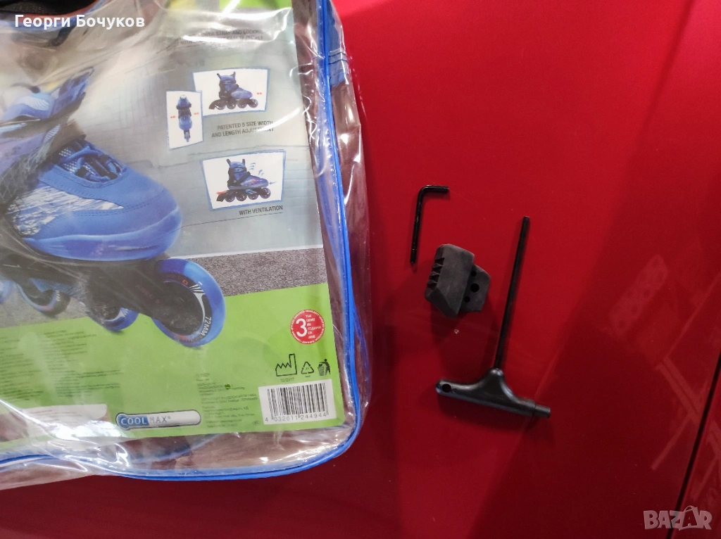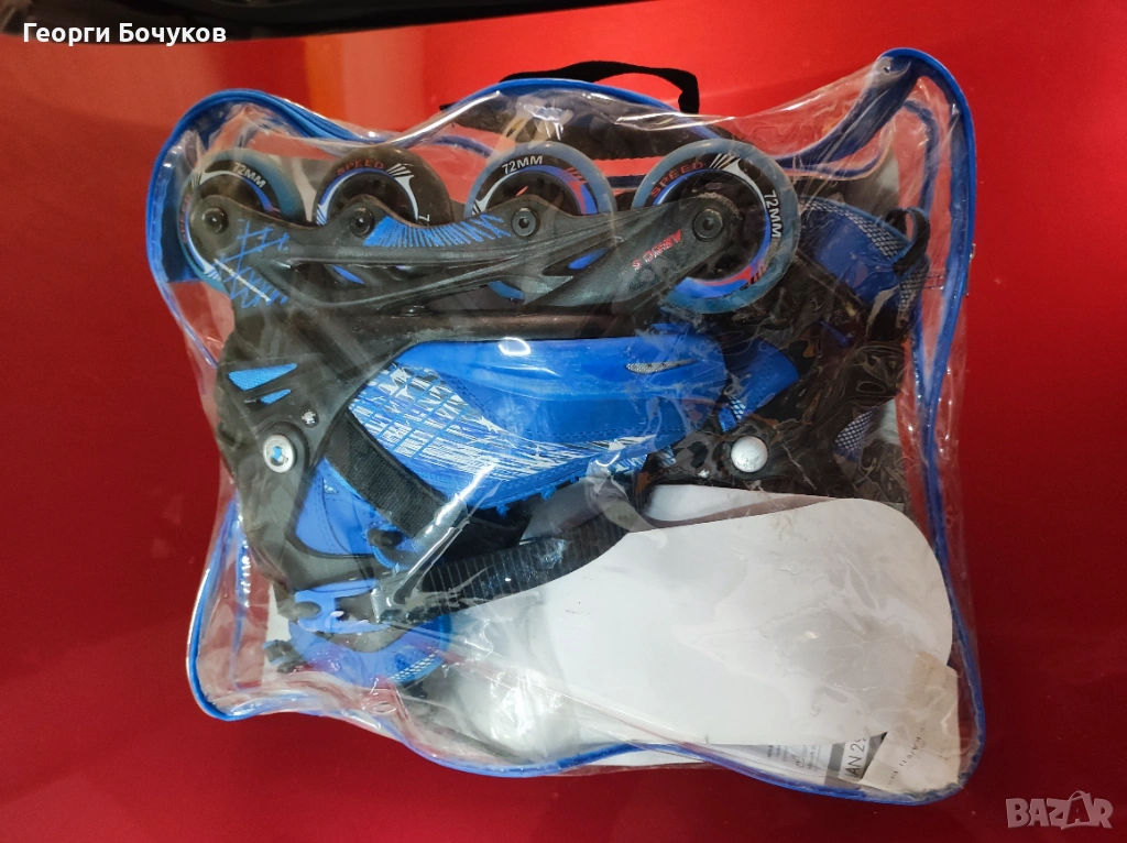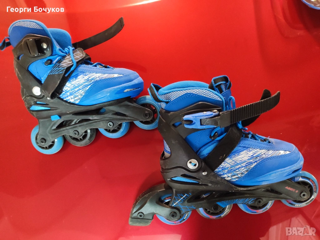 Ролери "Crivit" регулируеми от 33 до 37 номер, колела 72 - 24 мм., сачмени лагери ABEC 5 - хромирани. Фиксирано закопчаване с двойна катарама и оптимално отвеждане на влагата. Към тях има резервна спирачка и ключе за смяна на гумите, както и чанта за съхранение. Нямат забележки с изключение на няколко драскотини по външната страна.