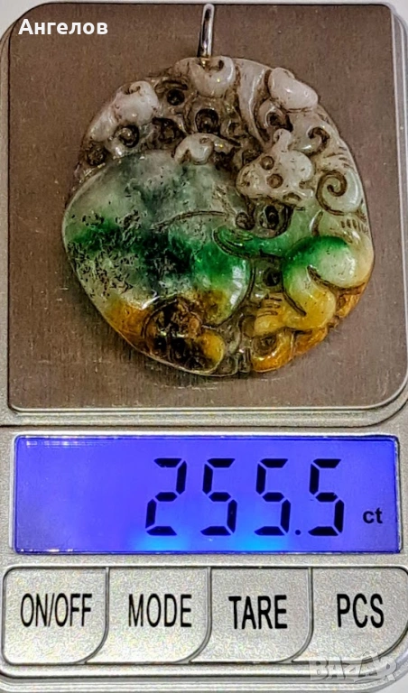 Но истинската стойност е на медальона - старинна прецизна изработка върху грижливо подбран къс с уникални разцветки, съчетан с богата символика от китайската култура. Стилът и цветовете (зелено, бяло и оранжево/кафяво) са характерни за класическия т.нар. "трицветен нефрит" (често наричан San Cai или "Фу Лу Шоу"), който е изключително рядък и се смята за особено благословен, имволизиращ щастие, богатство и дълголетие.