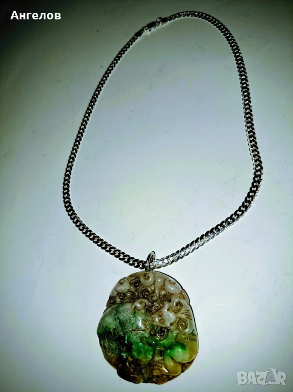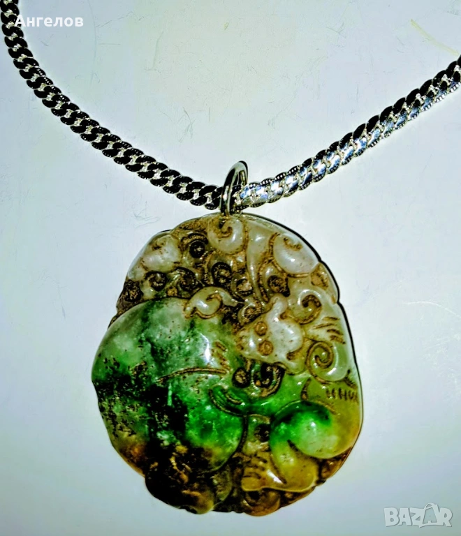 Уникален старинен медальон/амулет от нефрит със сребърен ланец