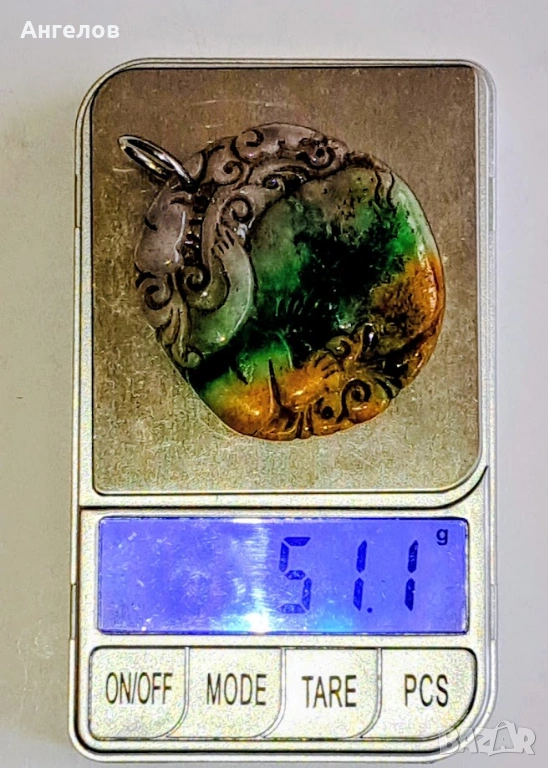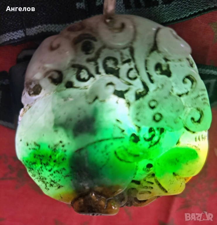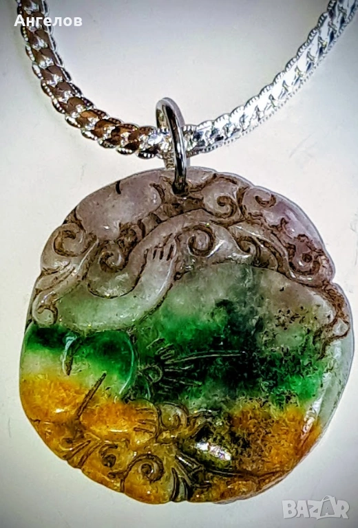 Ексклузивен като качество на материала - естествен нефрит (жадеит) и изработка - двустранна дълбока резба. На снимките е показано теглото в грамове и карати. На последната снимка се вижда прозрачността на нефрита под изкуствено осветление. Може да се носи и на врата, и окачен в дома или офиса като силен амулет. Ланецът е плетка Панцир с шир. 4 мм и дължина 50 см. Маркиран проба 925. Тегло над 20 г.