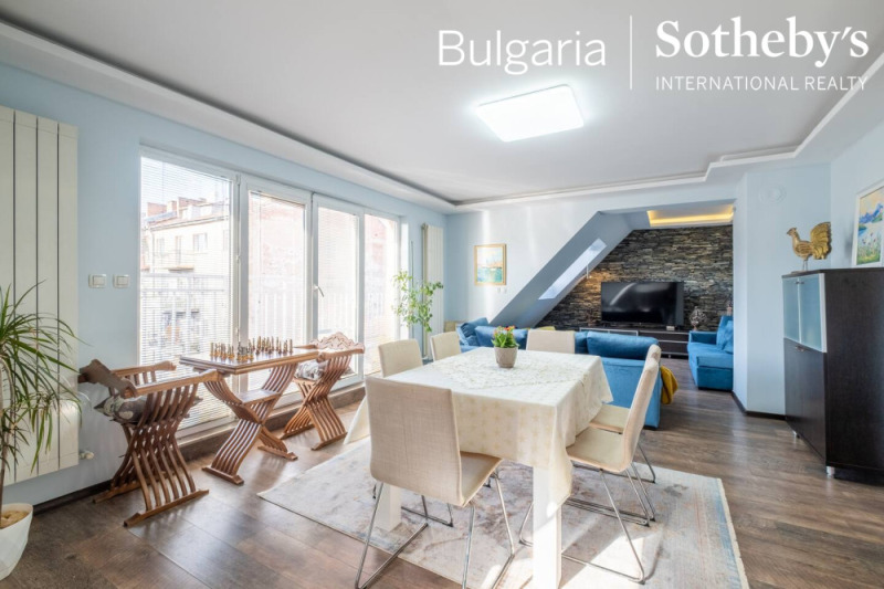 BULGARIA SOTHEBY’S INTERNATIONAL REALTY представя ексклузивно на Вашето внимание тистаен апартамент със собствен вход директно от асансьора. Разположен в сърцето на София на ул. Цар Асен и ул. Солунска. Апартамента е светъл, артистичен, обзаведен с вкус и топлина.