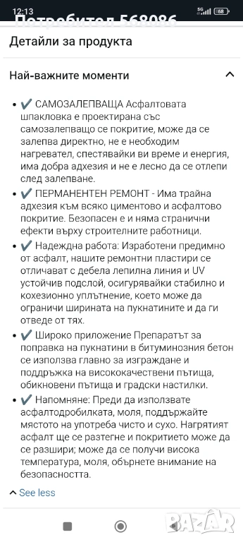 Асвалтова лента за ремонт на пукнатини в асвалт,бетон и други,без нужда от загряване.10м/5см/3мм,пълно описание на последната снимка