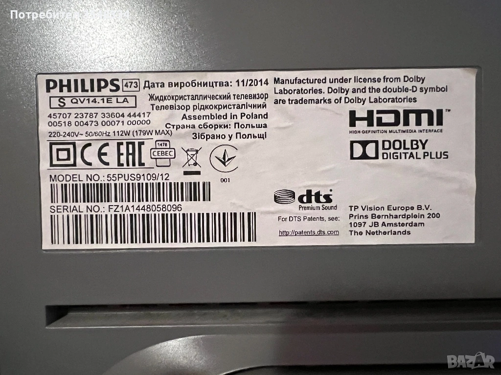 Продавам Philips 55PUS9109/12 55 4K UHD + Активен субуфер / бас модул