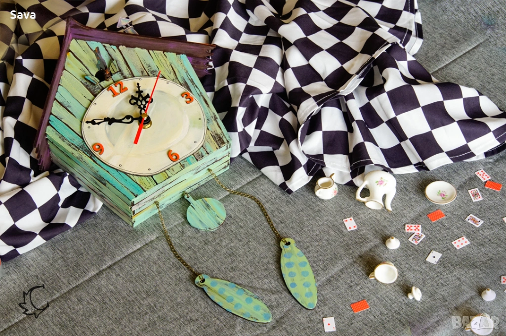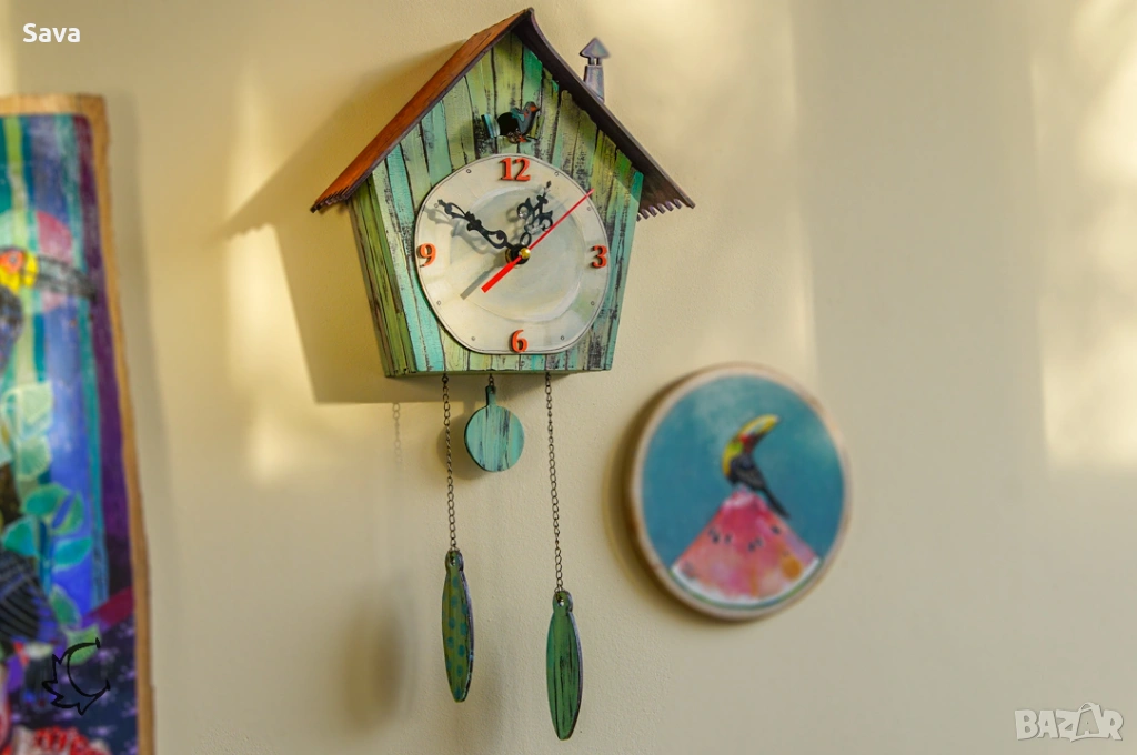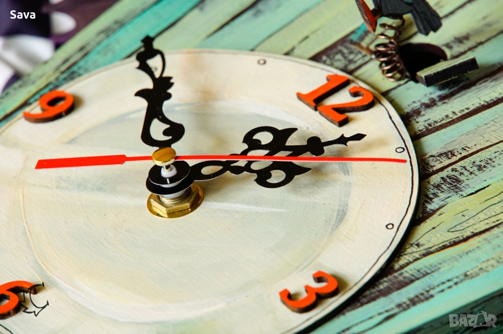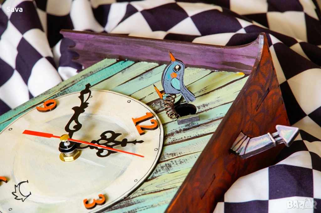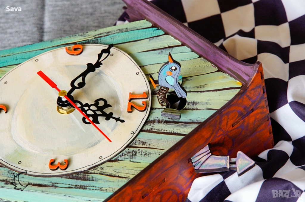 Корпусът е изработен от дърво, с артистично състарен ефект и меки, хармонични цветове. Малката птичка, поставена на пружинка, добавя закачлив акцент и „оживява“ часовника при всяко движение. Контрастните стрелки и релефните цифри осигуряват добра четимост, а класическият механизъм го прави практичен и надежден.
