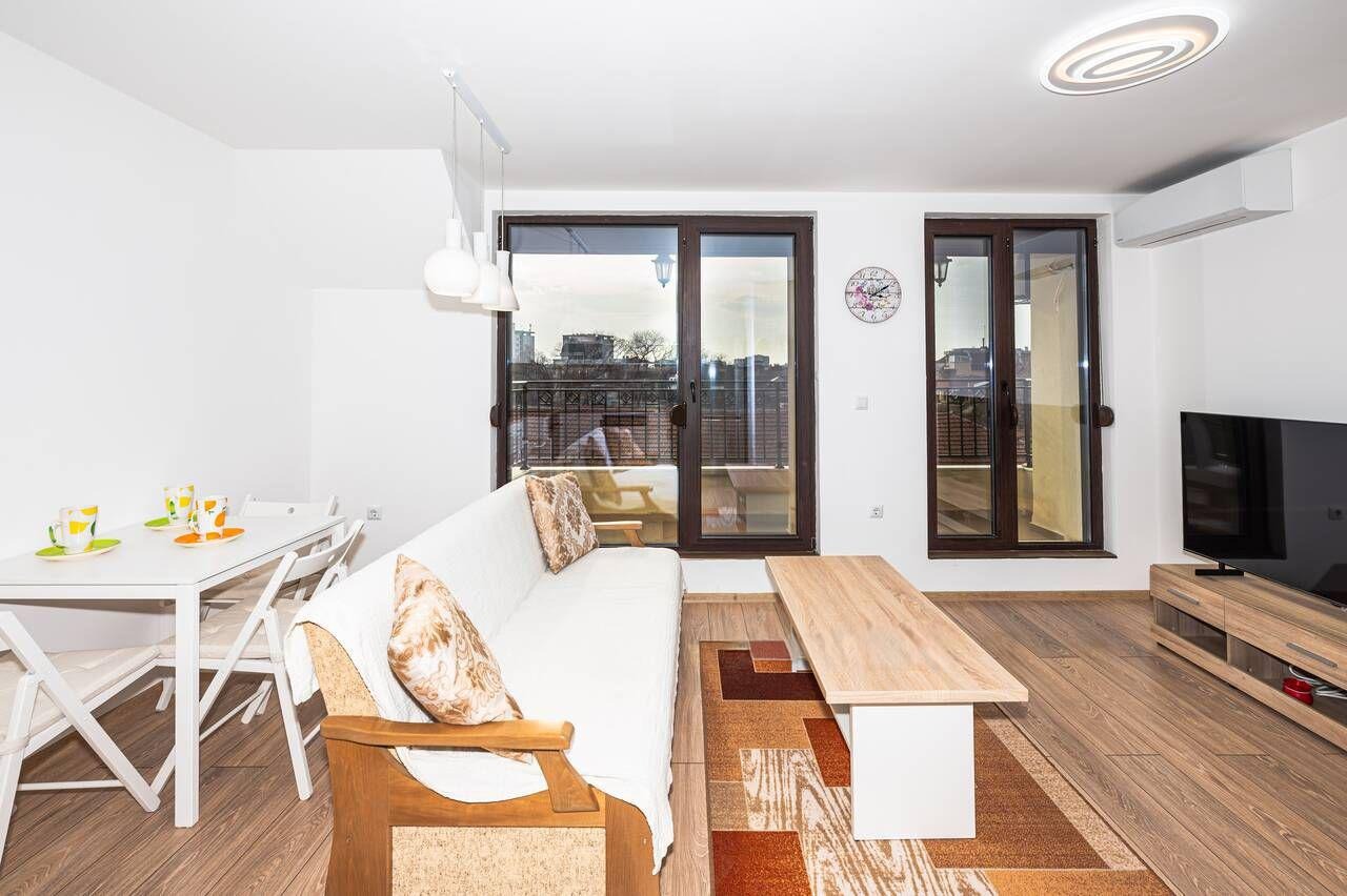 Жилището се предлага напълно обзаведено и оборудвано с нови, енергоспестяващи електроуреди и климатици във всяка стая.