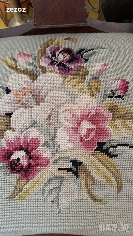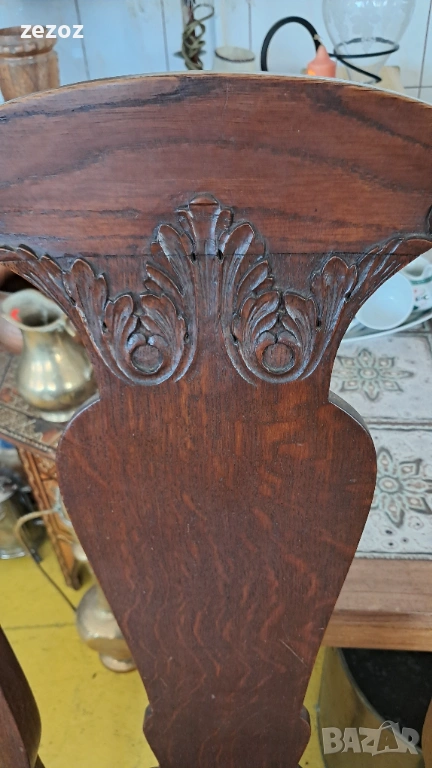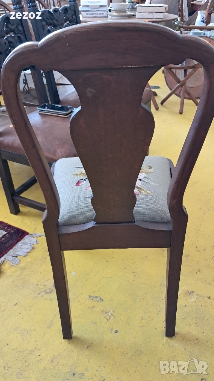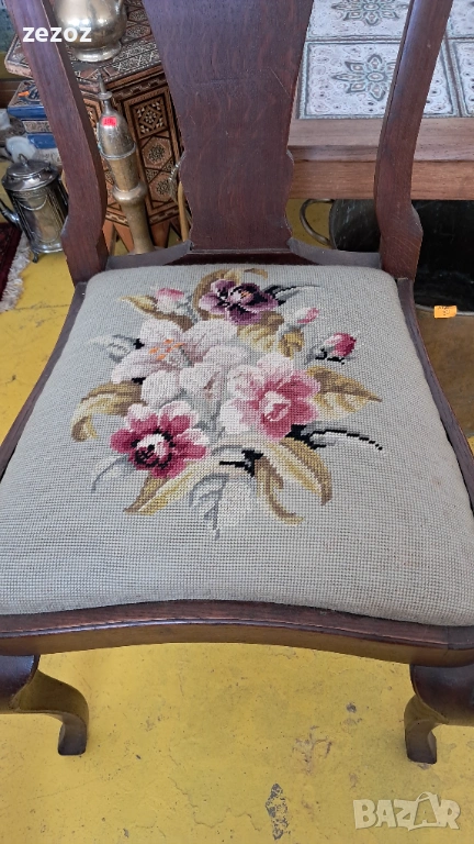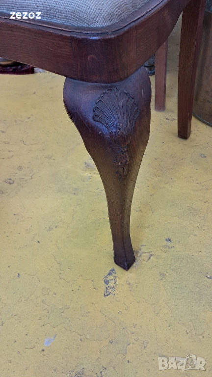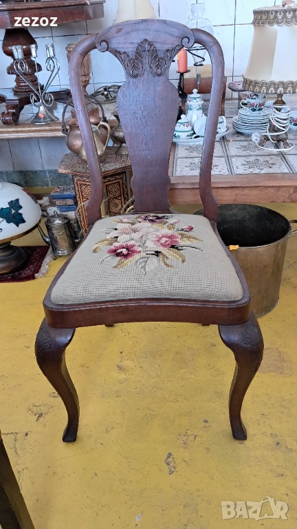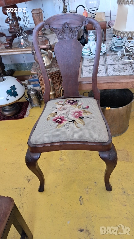 Единична бройка.Масив дъб.Изработен в стил"Кралица Ана".Гобленова дамаска в много добро състояние.Дърворезба по характерните силно извити в горната част крака.Седалка с пружини.Стола е една идея по-висок от стандартните,по подходящ за бюро.Много запазен и здрав.Размери-
