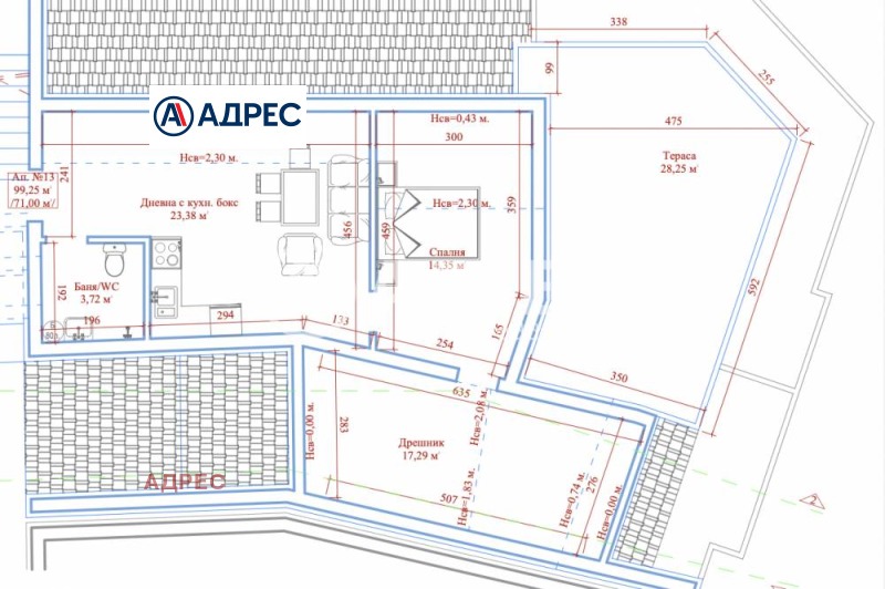 Имота се състои от дневна с кухненски бокс, голяма тераса, спалня, втора спалня или дрешник и баня с тоалетна