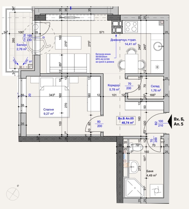 Квадратура: РЗП - 57.32 кв.м. / ЗП - 48.74 кв.м. / Общ.ч. - 8.58 кв.м./