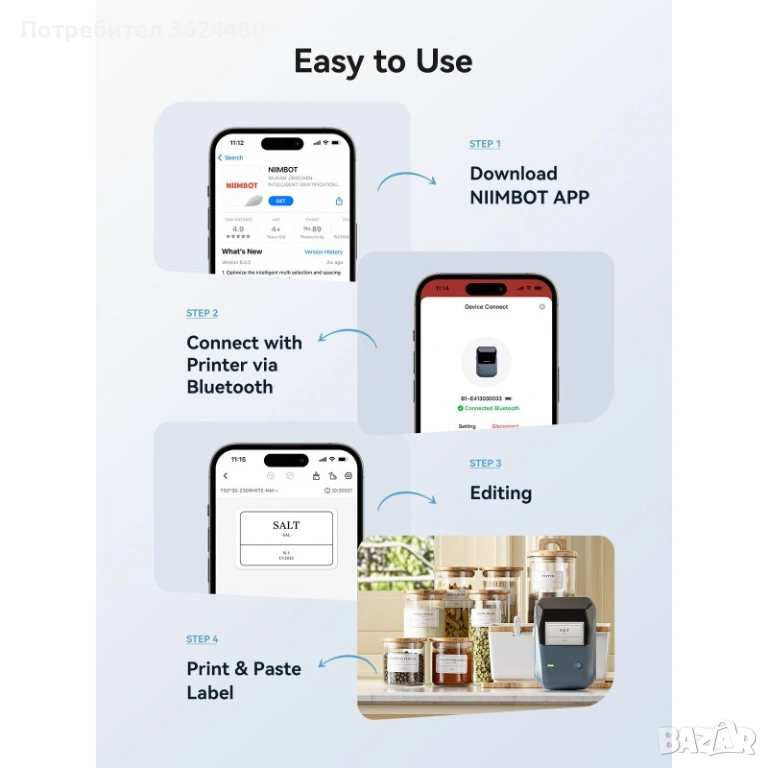 Оптимизирайте работния си процес с мобилния термо принтер Niimbot B1 – професионалното решение за етикетиране без мастило. Този Bluetooth принтер за етикети и баркодове използва иновативната технология Direct Thermal, елиминирайки нуждата от скъпи касети и ленти. С ясна резолюция от 203 DPI и ширина на печат от 20 мм до 50 мм, той е идеален за създаване на ценови етикети, баркодове и QR кодове. Устройството е изработено от здрав ABS полимер и тежи само 300 гр., което го прави изключително портативно.