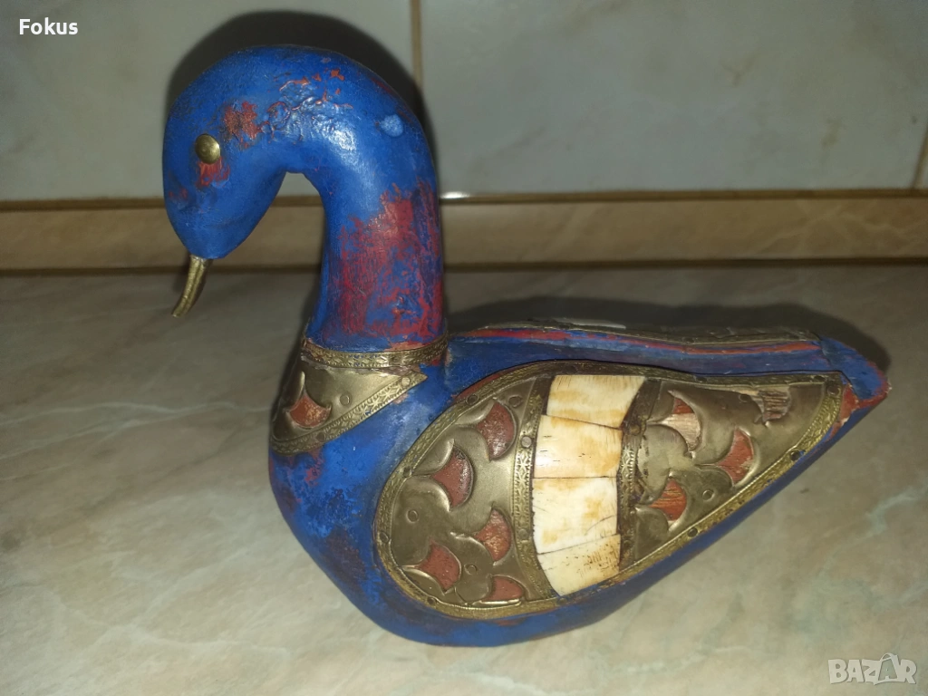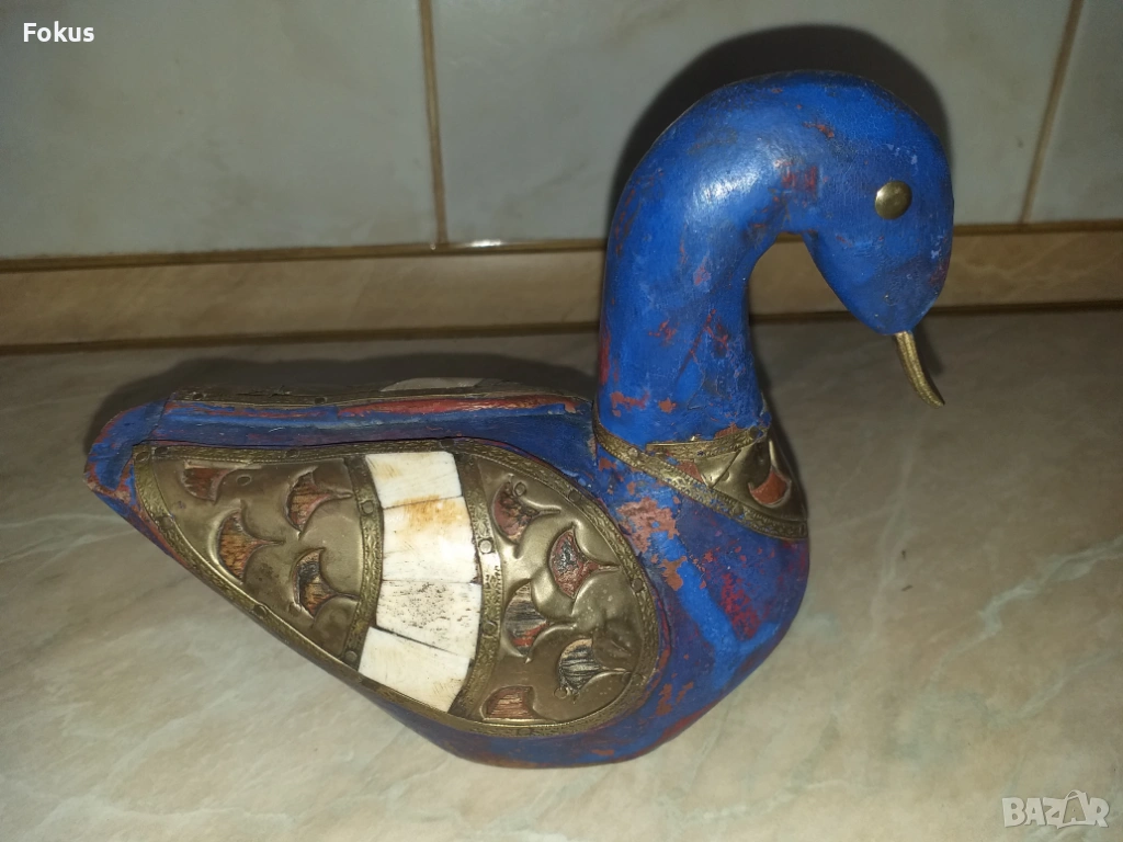 Страхотна синя дървена патица патка с месинг и кост → Обява 53356479