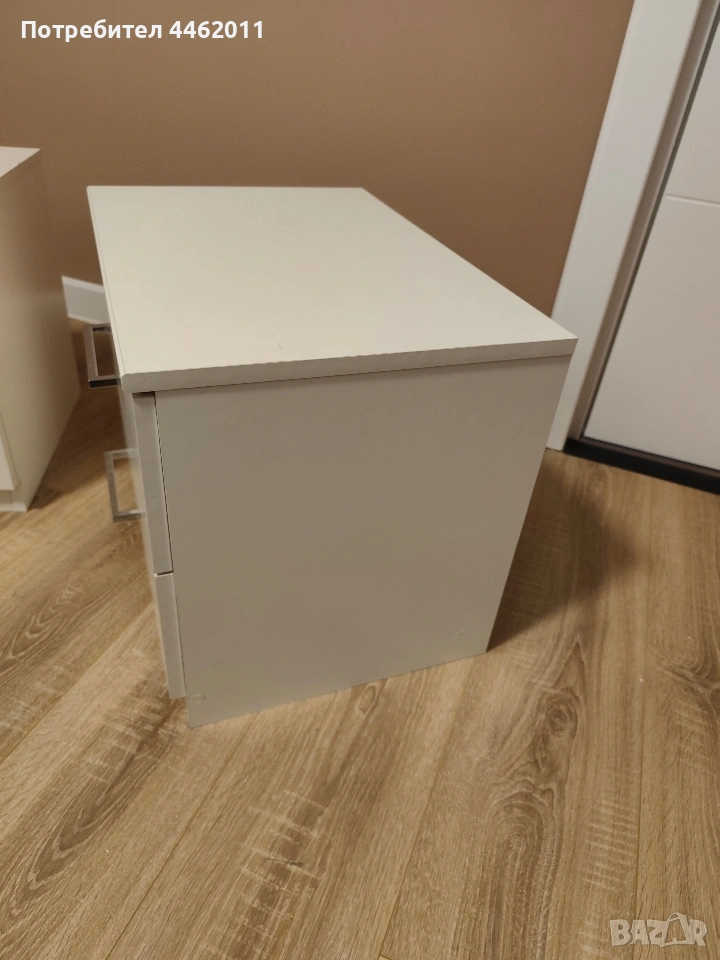 Продавам 2 бр. бели нощни шкафчета с две чекмеджета. Подходящи за спалня или дневна. Практичен и елегантен дизайн. Едното има лек дефект на горната част. Цената е за двата броя в комплект е съобразена с дефекта. Размери 52х37х40 см. (ШхВхД)