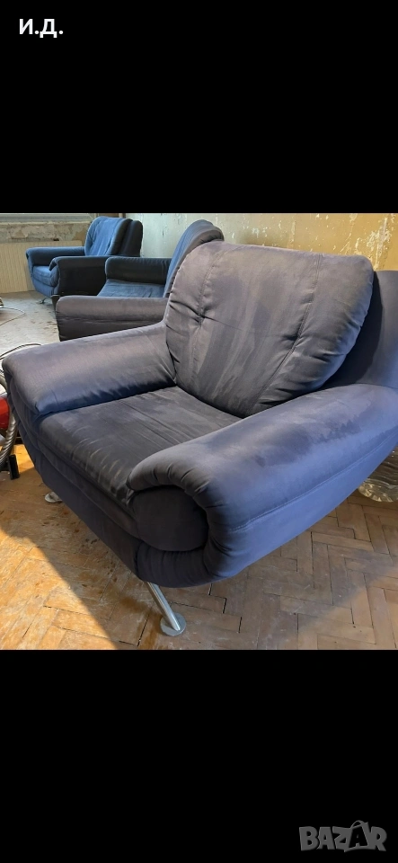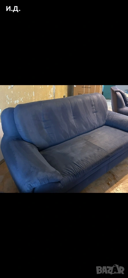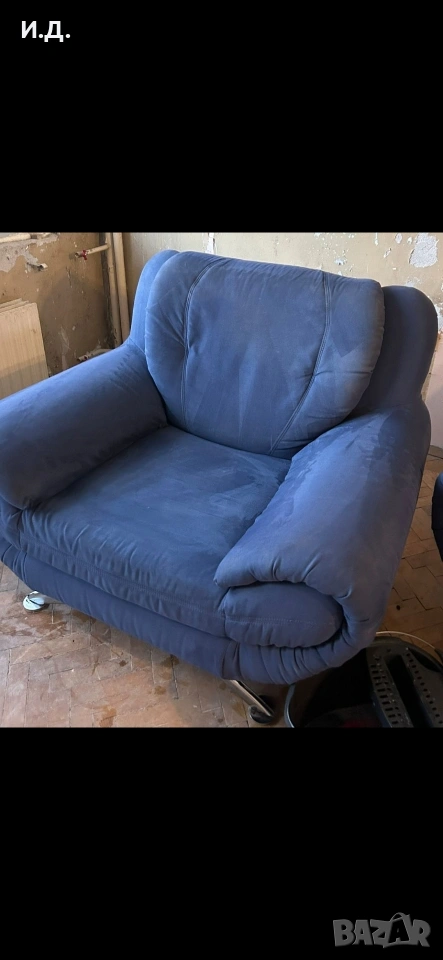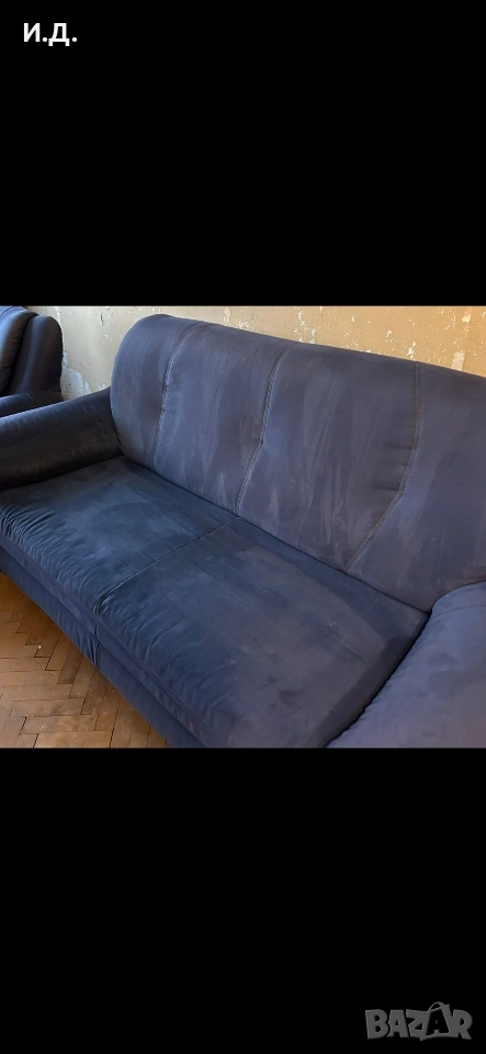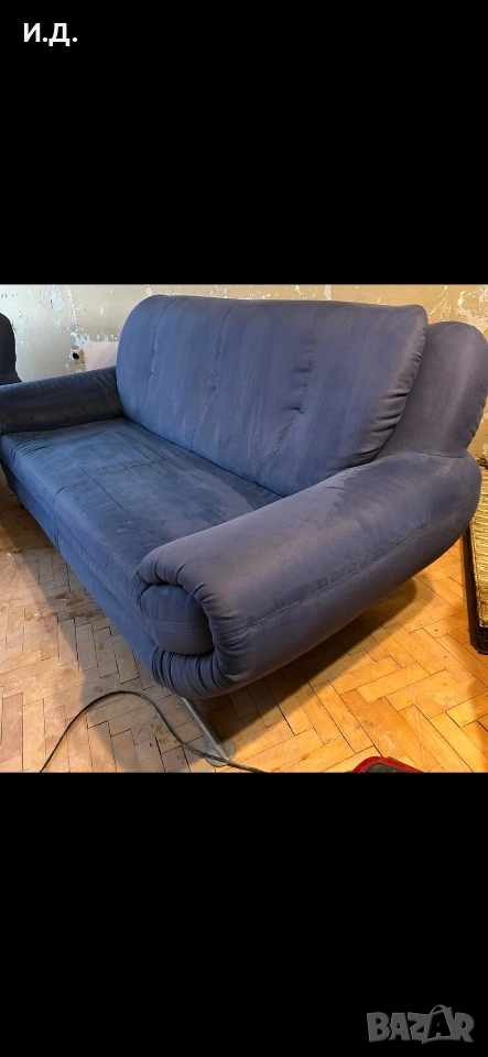 Дван и два фотьойла. Сино на цвят. Материята е може би плюш. Птлипбо състояние са, без никакви забележки. Краката са от никелирани тръби. Дължината на дивана е 2000 см. Широк 90 см. Фотьойлите са с размери 110/85 см. Намират се в град Плевен. Цена за комплекта диван +два фотьойла е 120 евро.