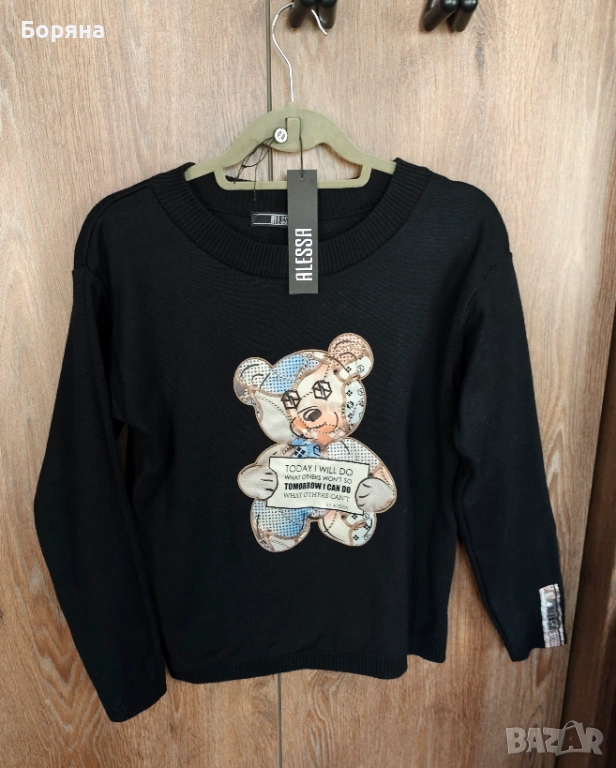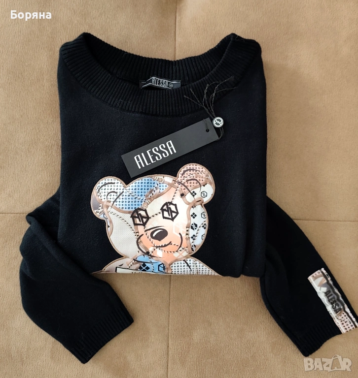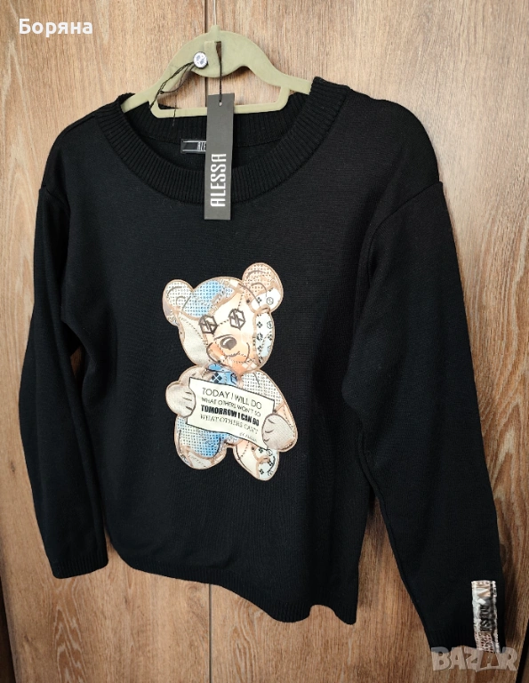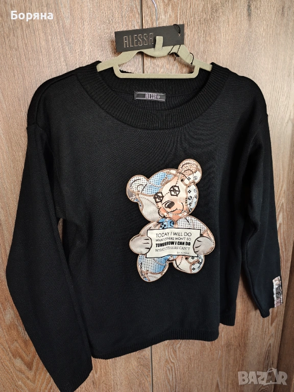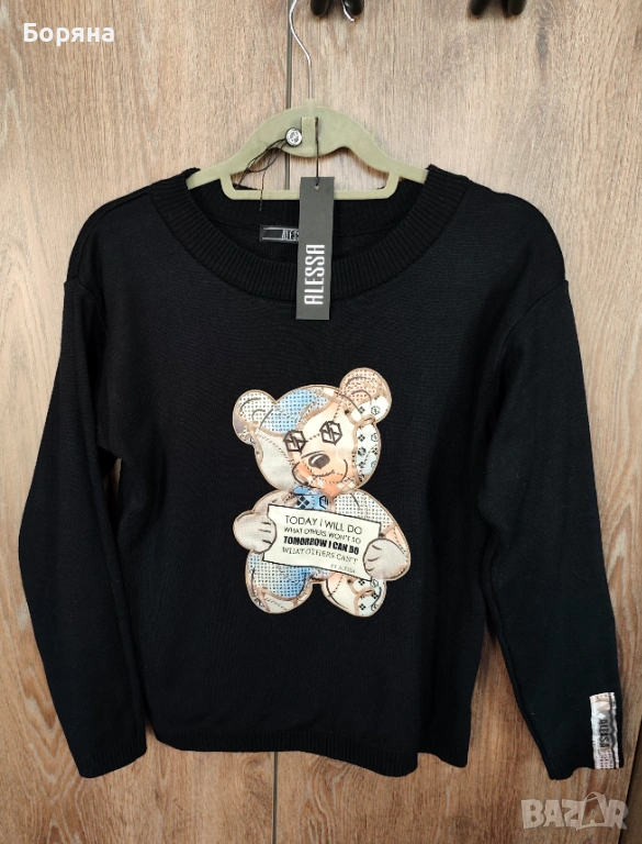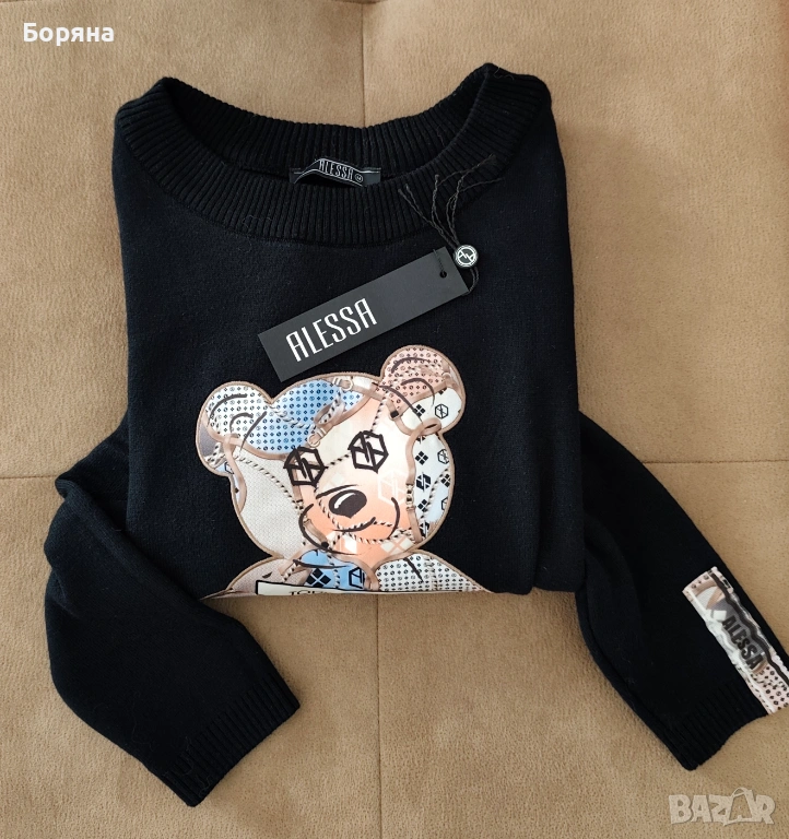 Страхотен пуловер Alessa с мече, обличан само един път, на мен ми е къс, затова се разделям с него.
