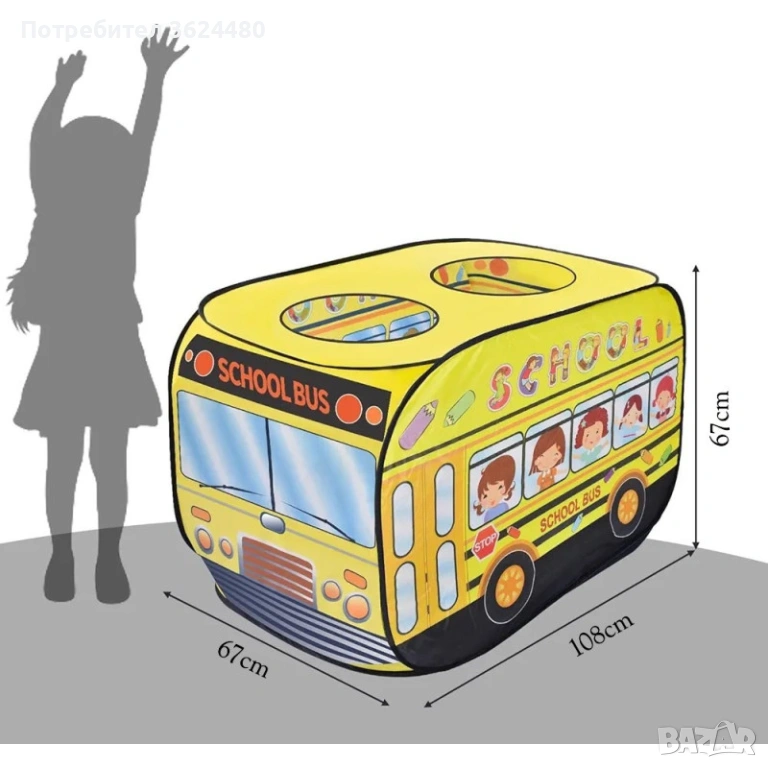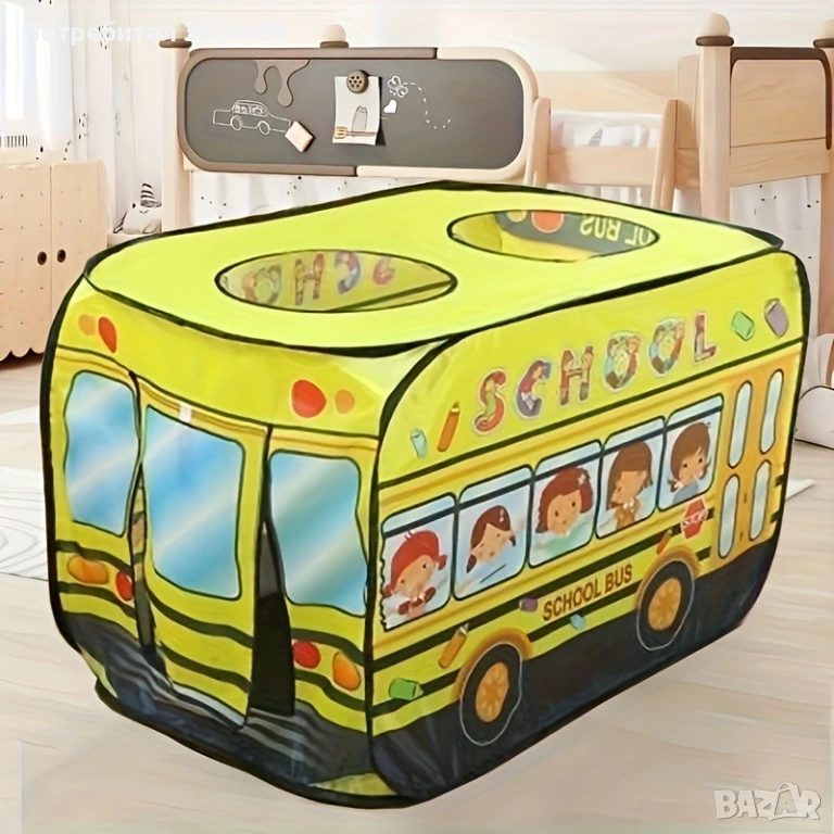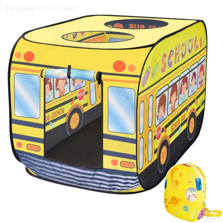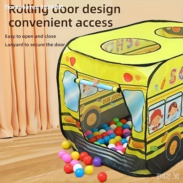 Това е саморазгъваща се палатка за стая с визия на класически жълт училищен автобус. Материята е чист полиестер, осигуряващ лекота и здравина на структурата. Моделът включва един вход отстрани и два покривни прозореца за вентилация и видимост. Когато не се ползва, се прибира до компактен кръг в приложената кръгла чанта с дръжки. Пакетът съдържа 1 брой Pop up палатка и 1 брой калъф за съхранение, като е важно да отбележим, че топките за игра не са включени.