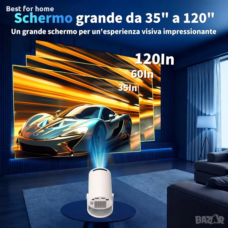 【Преносим проектор с HD качество】Проекторът е оборудван с 1080P HD обектив, представящ детайлни изображения на кинематографично ниво, с голям екран, който създава шокиращо визуално въздействие, позволявайки на потребителите да се потопят в завладяващо зрително изживяване. С малък външен вид на проектора, можете да го вземете със себе си по всяко време и навсякъде, за да започнете гледането на филми.