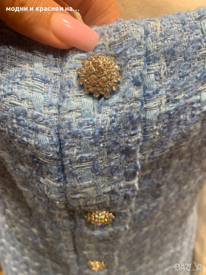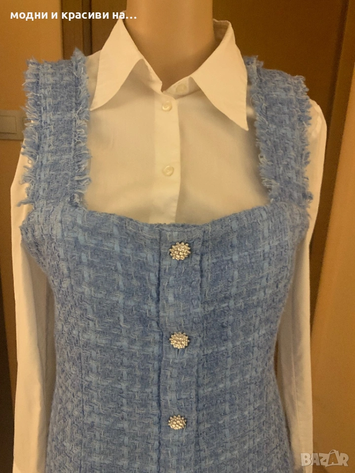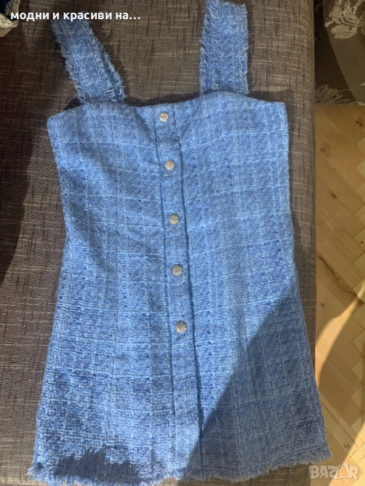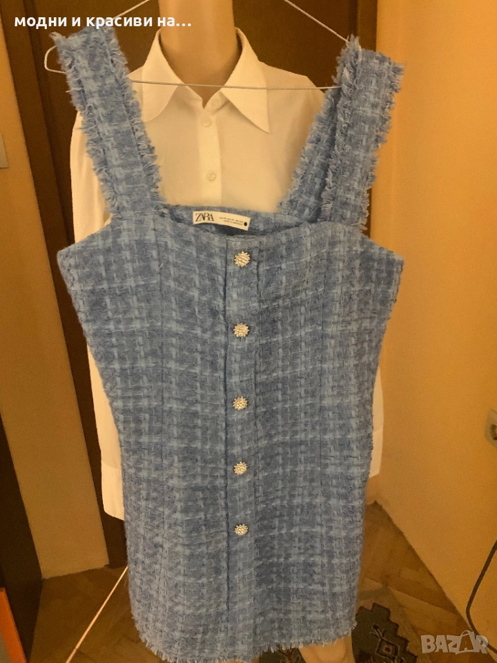 Тази рокля тип сукман на Zara е невеоятно бижу. Започваме с цвета- ярко небесносин въздействащ, покоряващ, открояващ се. Материята-букле. Вечно актуална, символ на женственост, на елегантност, на стил. Кройката-широки презрамки, в горната част по тялото, разкрояваща се надолу. Копчетата- невероятни! Блестящи като скъпо бижу, много ефектен акцент.