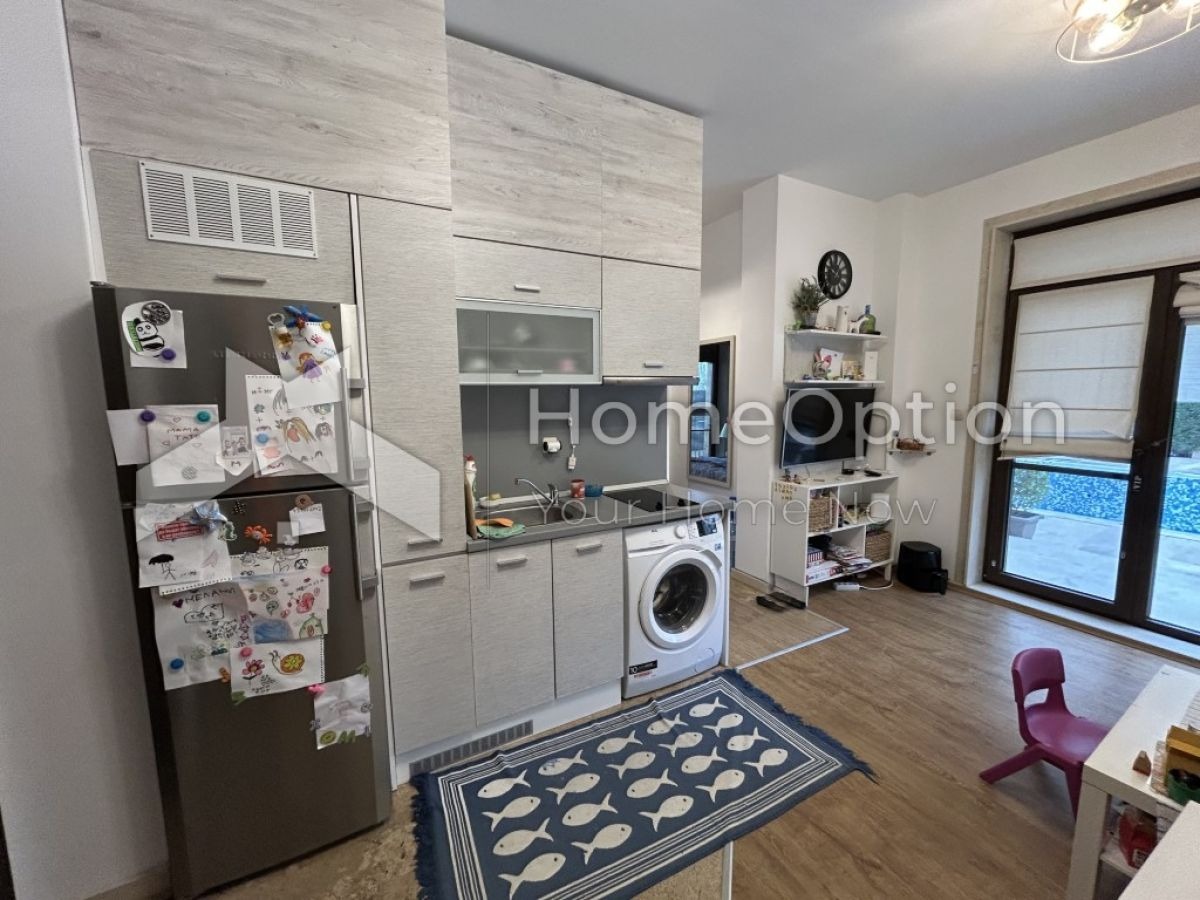 Жилището е компактно и практично с обща площ от 47.26 кв.м (от които чиста площ: 39.91 кв.м + 7.35 кв.м общи части) Намира се на на партерен етаж с пряк достъп до басейна, сградата разполага с Акт 16 и битов ток.
