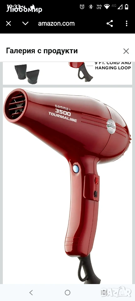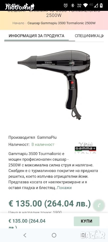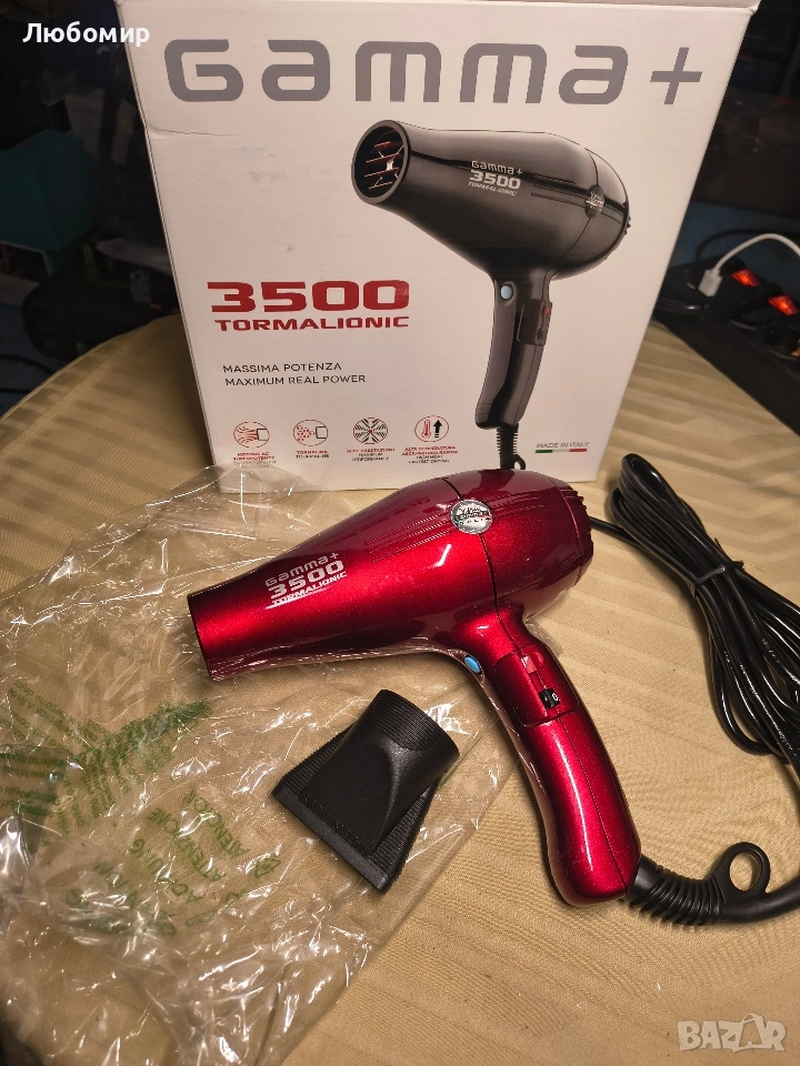 GAMMA+ 3500 Професионален сешоар с турмалинов йонен филтър, 1 дюзи, 6 настройки за топлина/скорост