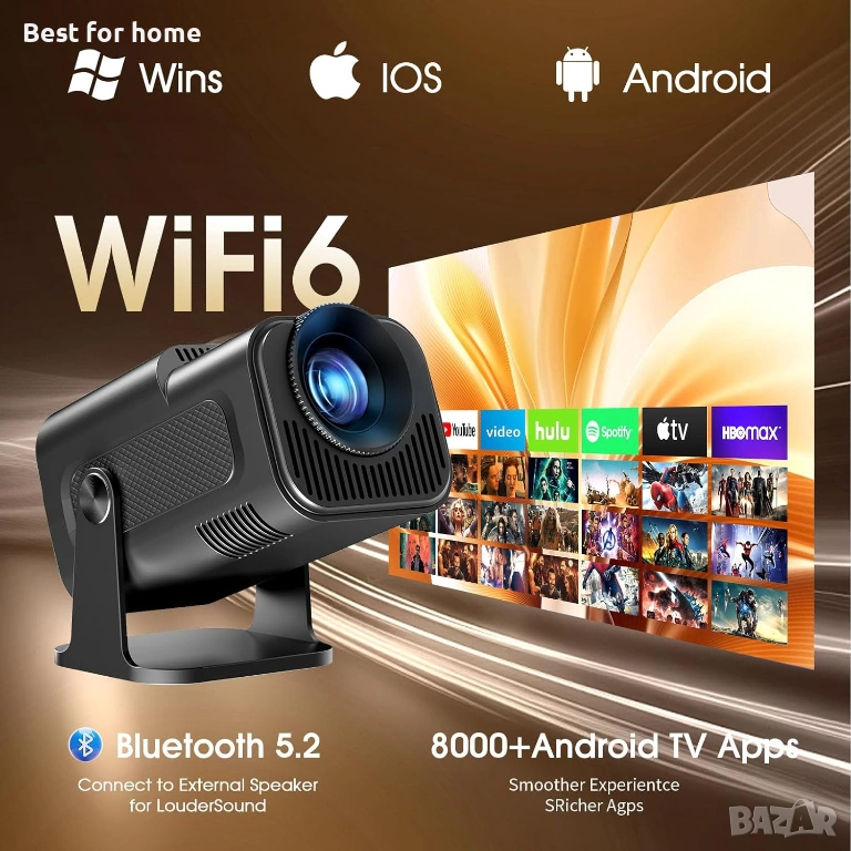 Мини проектор 1080P FHD 4K поддръжка Преносим проектор с WiFi и Bluetooth 180°