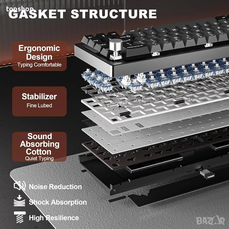 Gasket Mount конструкция: 4 слоя шумоизолация и Flex-cut PC платка за меко и приятно писане без вибрации.
