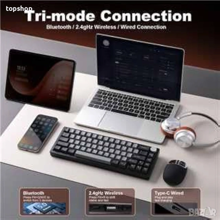 Tri-Mode свързване: Bluetooth, 2.4G безжична връзка и USB-C. Свързва се с до 5 устройства (Win/Mac/iOS/Android).