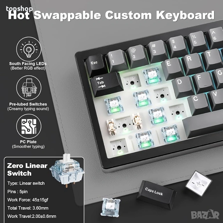 Суичове: Gateron Zero (фабрично смазани) – Hot-swap (сменят се без запояване).
