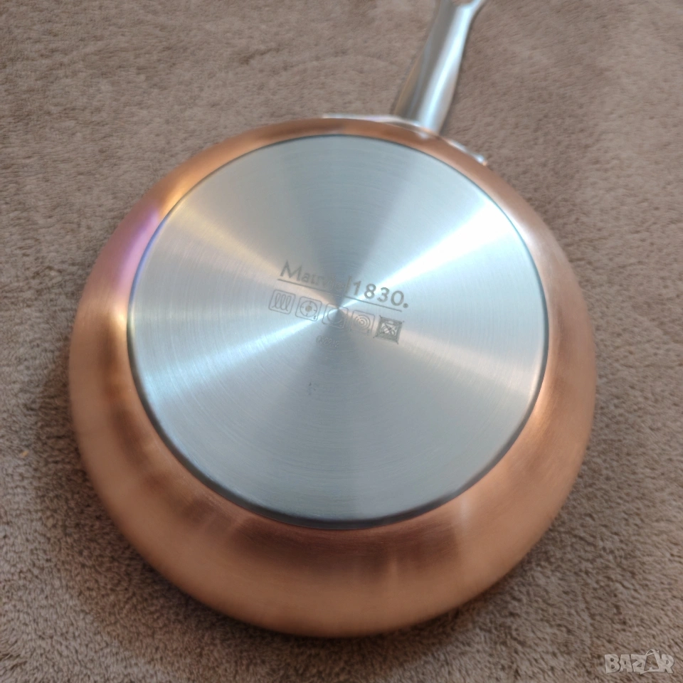 Нов тиган Mauviel 1830, Франция, меден от външната страна, нераждаема стомана отвътре, няма забележки. Еконт, Спиди, лично предаване. Телефон за връзка 0885776829.