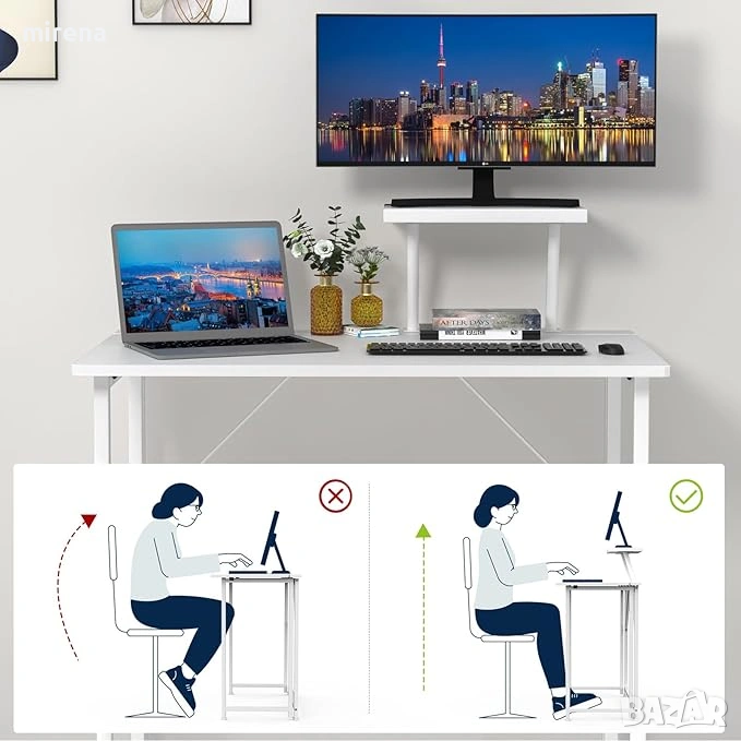 Подвижен рафт: адаптирали сме допълнителни малки работни плотове с размери 30 x 19 см за бюрото, които могат да се разглобяват и местят наляво и надясно, а позицията им може да се регулира според вашите навици, което е много гъвкаво. Стойката за монитор на масата за компютър ви предлага ергономична височина за гледане, когато седите на масата за лаптоп, като същевременно предлага повече място за офис аксесоари и максимално използва пространството ви.
