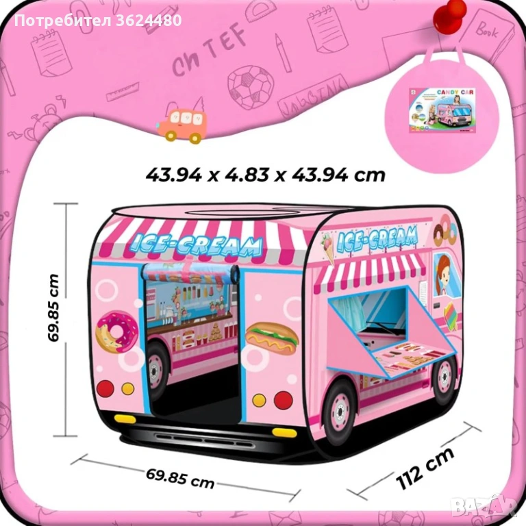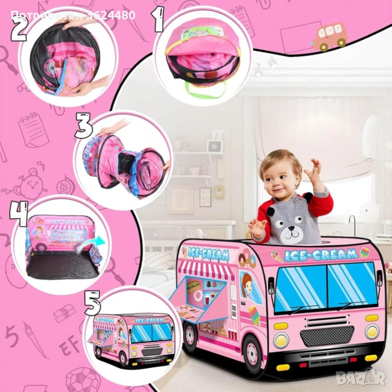 Този продукт представлява саморазгъваща се конструкция със строителна тема на сладкарница на колела. Визията включва камион за сладолед в розовата гама с детайлни илюстрации. Използваната материя е фин и устойчив полиестер, подходящ за игра в стая или на тревата в градината. Препоръчва се за малчугани, навършили 3 годишна възраст. Комплектът включва 1 брой сгъваема детска палатка Розов бус за сладолед и 1 брой текстилна чанта за съхранение с удобни дръжки.