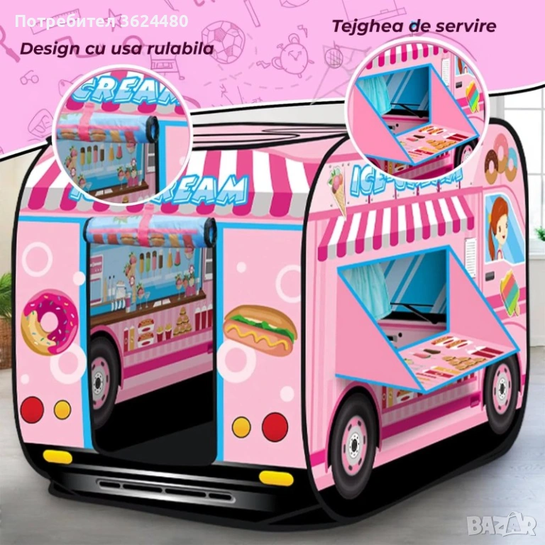 Превърнете дома или двора си в любима дестинация за десерти с тази прекрасна детска палатка камион за сладолед. Дизайнът е вдъхновен от сладките изкушения и разполага с функционално гише за сервиране и ролетна врата, които стимулират въображението и ролевите игри при децата. Наситеният розов цвят и забавните графики с понички и сладоледи я правят перфектния подарък за малките принцеси.