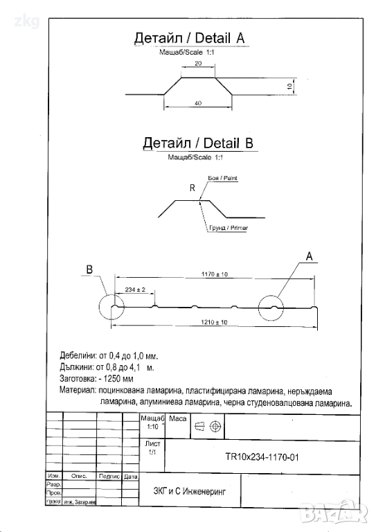 същия материал на капаци за било, обшивки, улуци, водостоци, казанчета и други