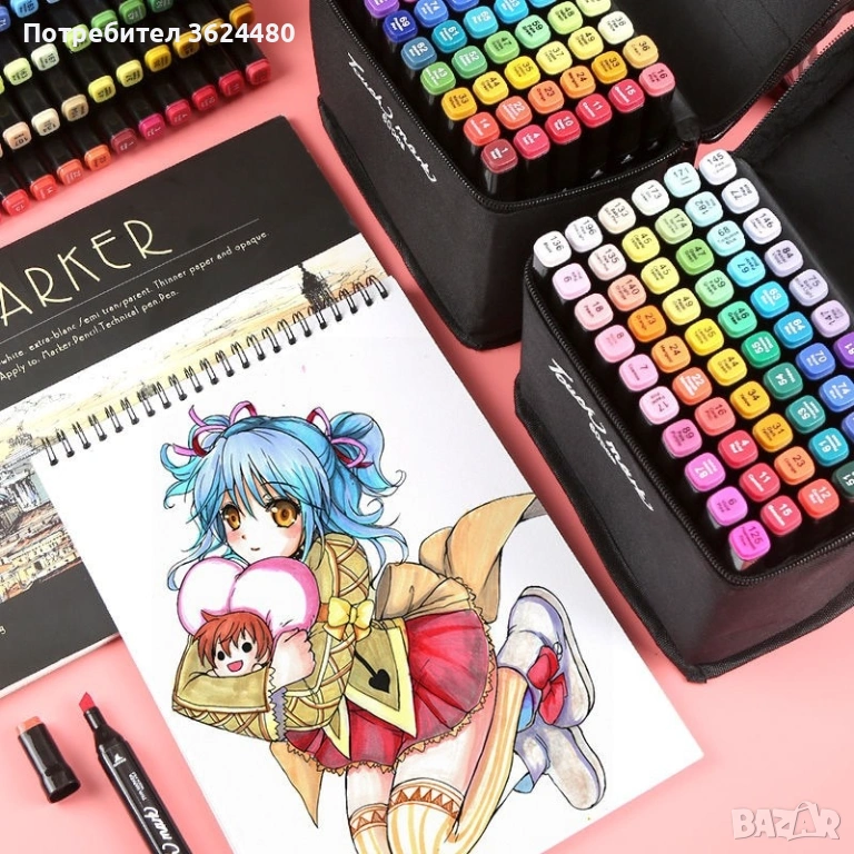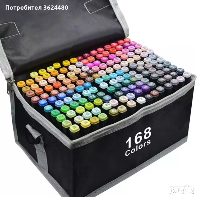 Подробни характеристики и съдържание на комплекта Общото количество в пакета е 168 броя маркери. Мастилото е на алкохолна основа и е напълно безопасно за употреба. Дизайнът включва два типа писци, като единият е тънък и кръгъл, а другият е широк и скосен. Всички капачки са маркирани с цифри и съответстващи цветове за удобство. Комплектът включва 168 броя алкохолни маркера и удобна текстилна чанта с цип за лесен транспорт и сигурно съхранение.
