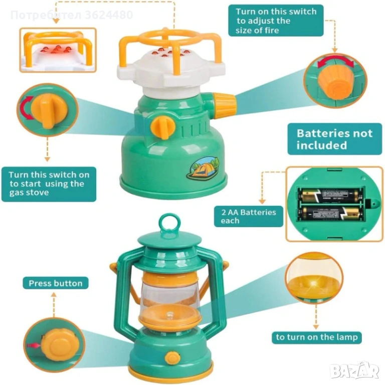 Аксесоари: Бинокъл (10см), Газена лампа (16.5см), Къмпинг лампа (12см), Ръчен часовник (21см), Манерка (13см), Лопатка (8см).