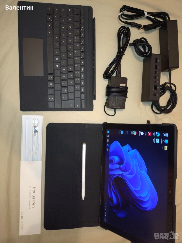 Таблет-лаптоп Microsoft Surface Pro 7 Предпазен калъф и матов протектор на екрана. Продава се комплект лаптоп, докинг станция (със зарядно), клавиатура, зарядно и писалка Нова инсталация на Windows 11 Pro с дигитален лиценз + всички нужни програми за работа Процесор: 10th Gen Intel® Core™ i7-1065G7, 4 cores, 8 threads, 1.30 → 3.90 GHz, 8MB SmartCachе Видеокарта: Intel Iris Plus Graphics Оперативна памет: 16 GBDDR4 Екран: 12.3-инчовPixelSense капацитивен мултитъч екран с резолюция 2736 x 1824 пиксела (4К) Памет: 256GB SSD Свързаност: Bluetooth 5.0, Wi-Fi 6: IEEE 802.11 a/b/g/n/ac/ax Функционалност: пълноразмерен USB 3.0 порт microSDXC картов четец Surface Connect (магнитен, за зарядно и докинг) 3.5 мм аудио жак микрофон 1 x USB type-C Cover port (магнитен, за клавиатура) 1.6W стерео говорители с Dolby Audio Premium акселерометър сензор за околна светлина Размери (Ш/В/Д): 292.10 x 201.42 x 8.5 мм Операционна система: Win 11 Pro 64-битова с дигитален лиценз Камера: 8-мегапикселова задна, 5-мегапикселова предна Батерия: 78-83 % живот (тествана 4-5 часа Youtube видео) Тегло: 770 грама Само лично предаване в София!