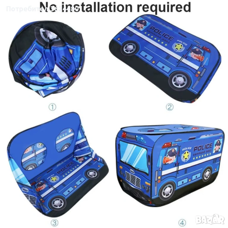 Съдържание: 1 х Сгъваема детска палатка "Полицейски бус" и 1 х Чанта за съхранение.