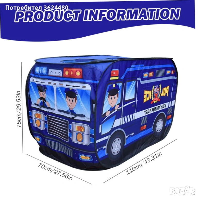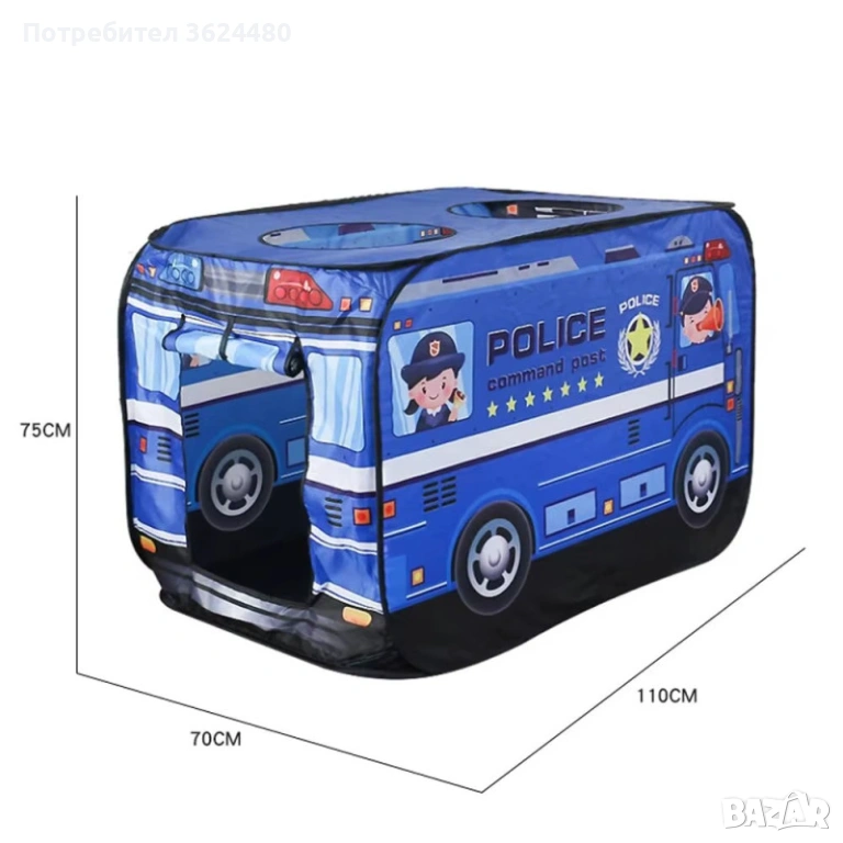 Съдържание: 1 х Сгъваема детска палатка "Полицейски бус" и 1 х Чанта за съхранение с дръжки.