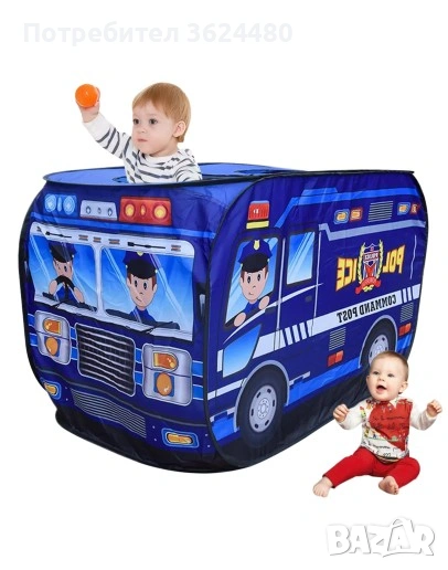 Пренесете детето си в света на реда и закона с тази атрактивна Детска палатка Полицейски бус. Дизайнът Команден пост в ярко син цвят стимулира ролевата игра и въображението. Това е саморазгъваща се (Pop up) палатка, която се разпъва моментално и се сгъва лесно за съхранение.