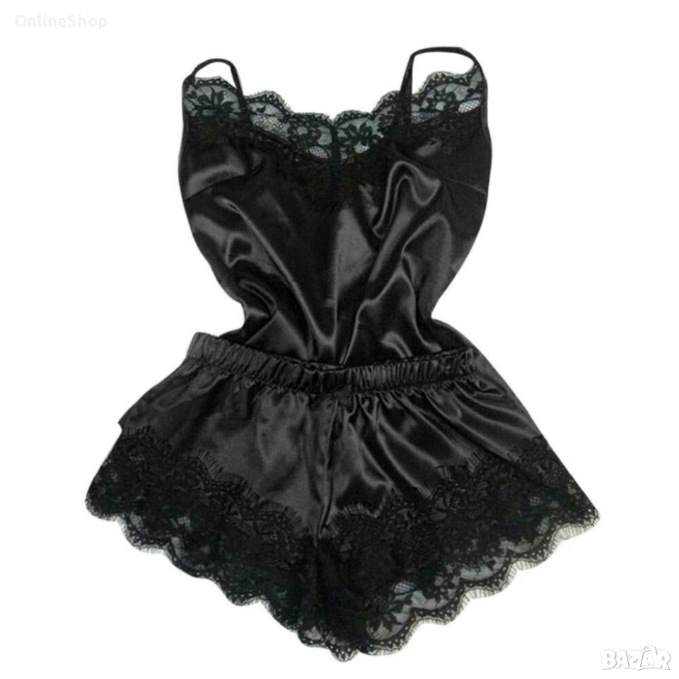 Ако търсите едновременно елегантна и секси дамска пижама за лятото, то тази е точно за вас. Представяме ви този страхотен комплект, който включва 2 части – топ и къси панталонки. Топът е сатениран с тънки презрамки и дантелено деколте. Панталонките също са сатенирани с ластик и дантела по крачолите.