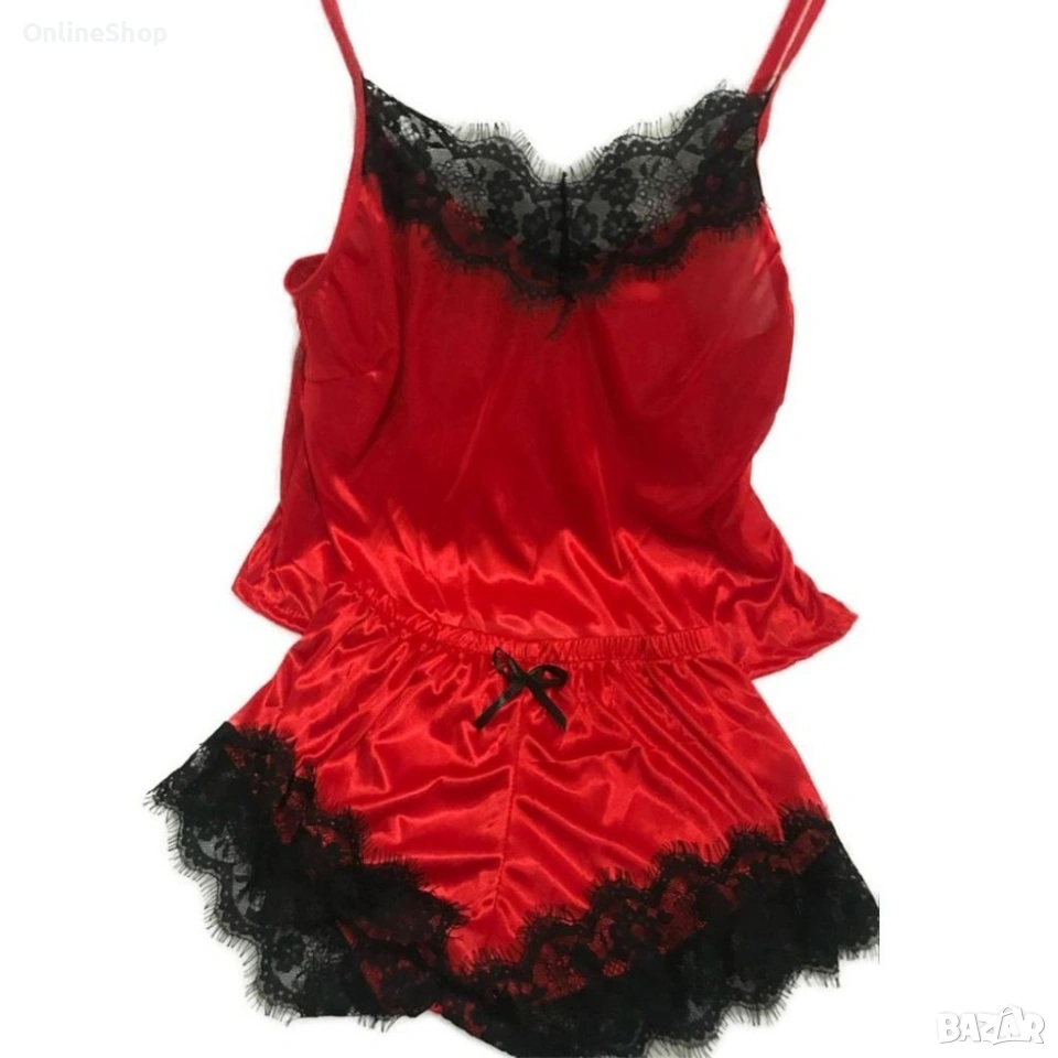 дамска пижама в 2 части – топ с тънки презрамки и къси панталонки. Предлага се в няколко размера S, M, L, XL, 2XL, и в няколко цвята – жълт, зелен, син, тъмночервен, цвят пепел от рози, сив, розов, цвят диня, черен + бял, червен, черен.