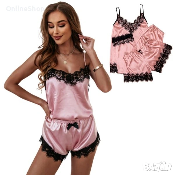 дамска пижама в 2 части – топ с тънки презрамки и къси панталонки. Предлага се в няколко размера S, M, L, XL, 2XL, и в няколко цвята – жълт, зелен, син, тъмночервен, цвят пепел от рози, сив, розов, цвят диня, черен + бял, червен, черен.