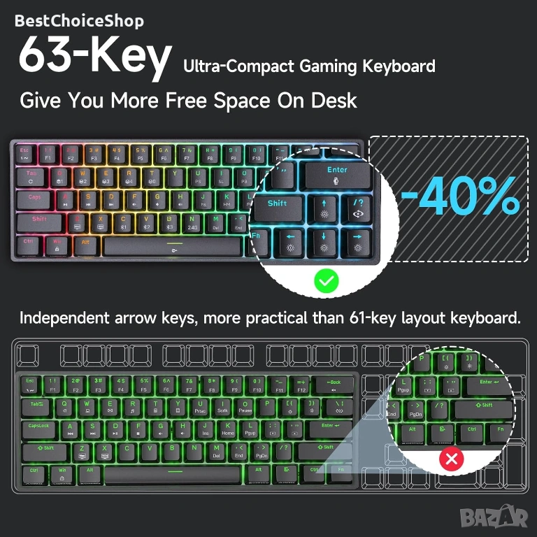 ✔️ Компактен 60% размер (63 клавиша) – спестява място
