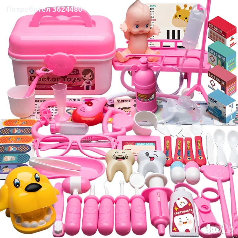 Този детски докторски и зъболекарски комплект с 60 части е перфектният подарък за деца, които обичат ролевите игри. Събрани в компактен розов куфар, тези 60 аксесоара превръщат всяка стая в медицински кабинет.