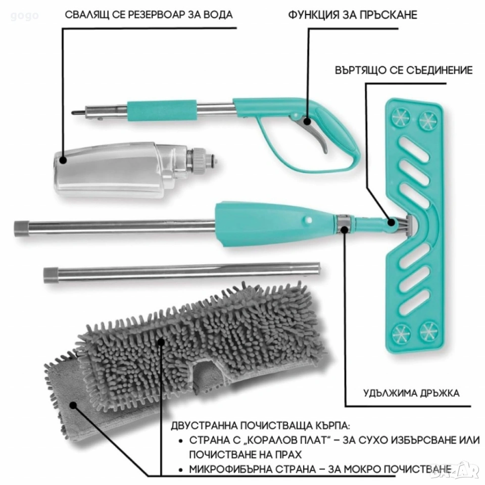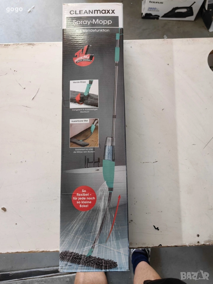 Спрей моп CLEANmaxx със сменяема кърпа и телескопична дръжка – чист под без кофа и без навеждане Цена: 32 евро Марка/модел: CLEANmaxx Spray-Mopp (mit Wendefunktion) Тип: спрей моп за сухо и мокро почистване Резервоар: свалящ се, ~700 мл Управление на пръскането: лост/спусък на дръжката Дръжка: удължима (телескопична/секционна) – обща дължина до около 168 см Глава: нископрофилна, с въртящо се съединение Размер на почистващата глава: ≈ 40 × 13 см Кърпа: двустранна – „коралов плат“ (сухо/прах) + микрофибър (мокро); пере се и е многократна Материали: алуминиева/стоманена дръжка, ABS корпус, микрофибърна кърпа Съвместими повърхности: ламинат, паркет, ПВЦ, плочки, камък и др. Съхранение: тънък профил; възможност за закачане Поддръжка: изплакване на резервоара; машинно пране на кърпата (деликатна програма)