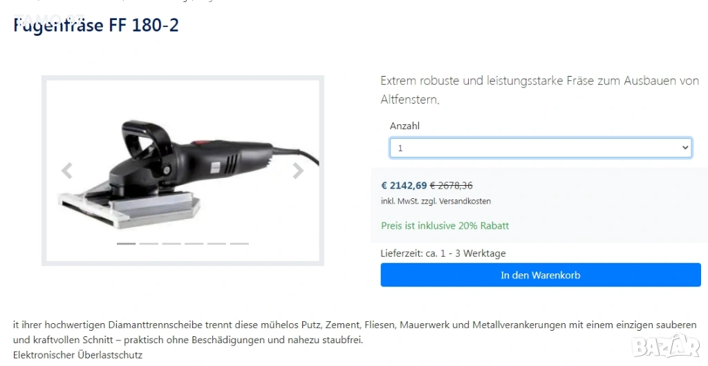 Продавам професионална подрезна машина на Вюрт, която е предназначена за подрязване на рамки на врати и прозорци с дебелина до 50мм благодарение на което се запазва оригиналния светъл отвор. Машината има козметични следи от използване, но работи отлично. Оригинално немско производство от 2024г внос от Франция. Пращаме с опция преглед и тест с куриерска фирма еконт може и лично предаване за гр. Шумен.