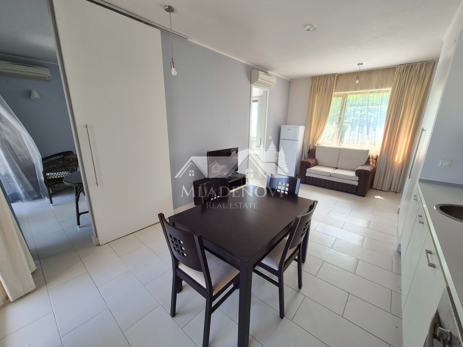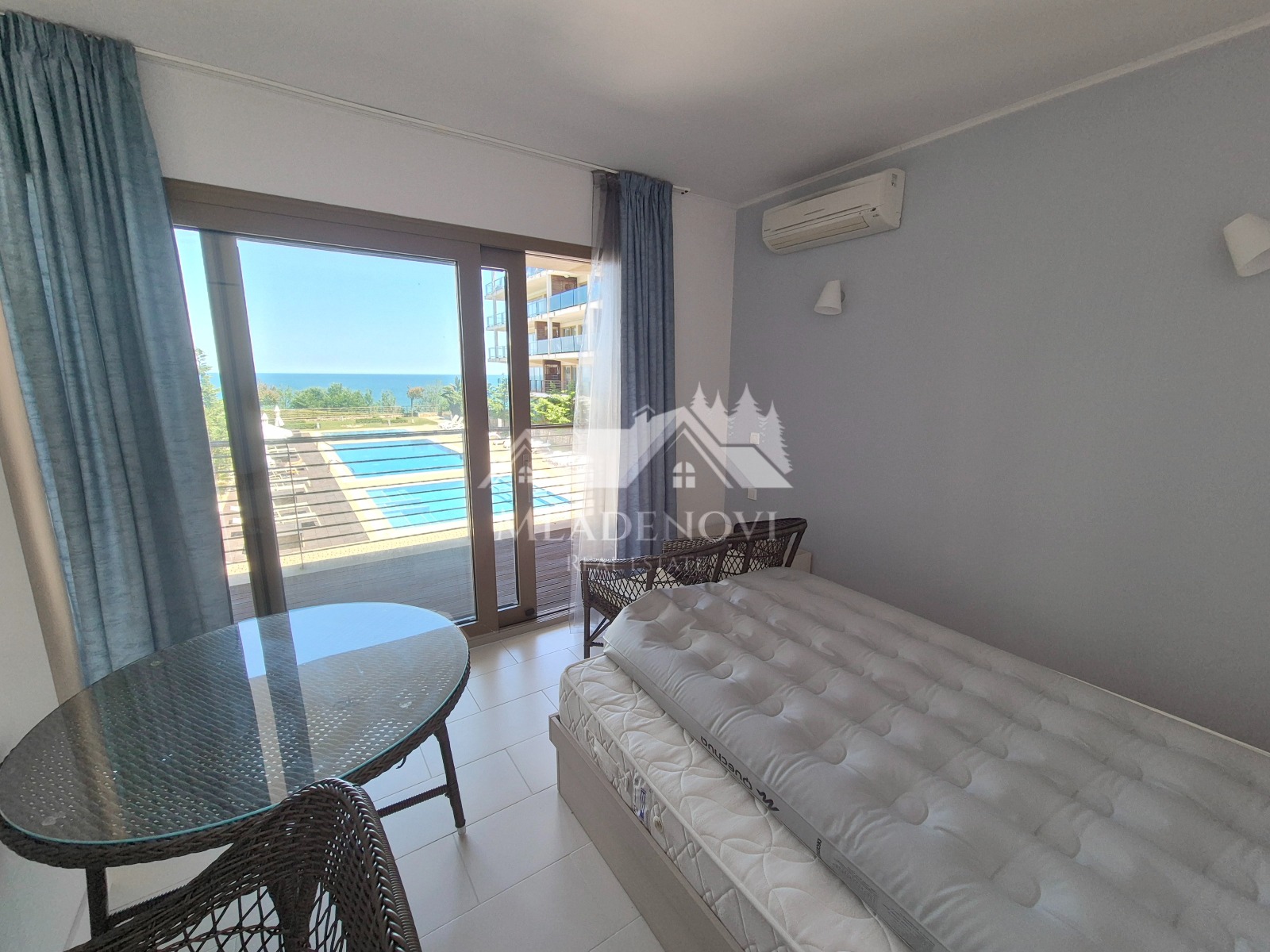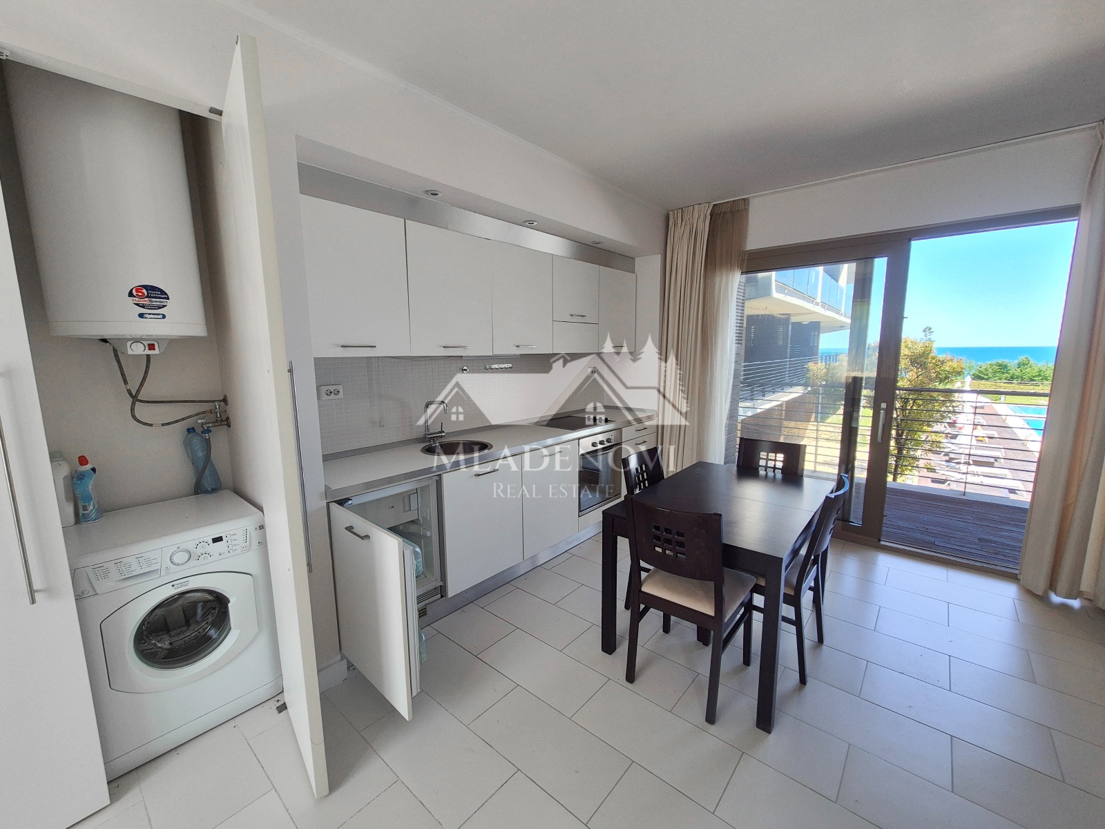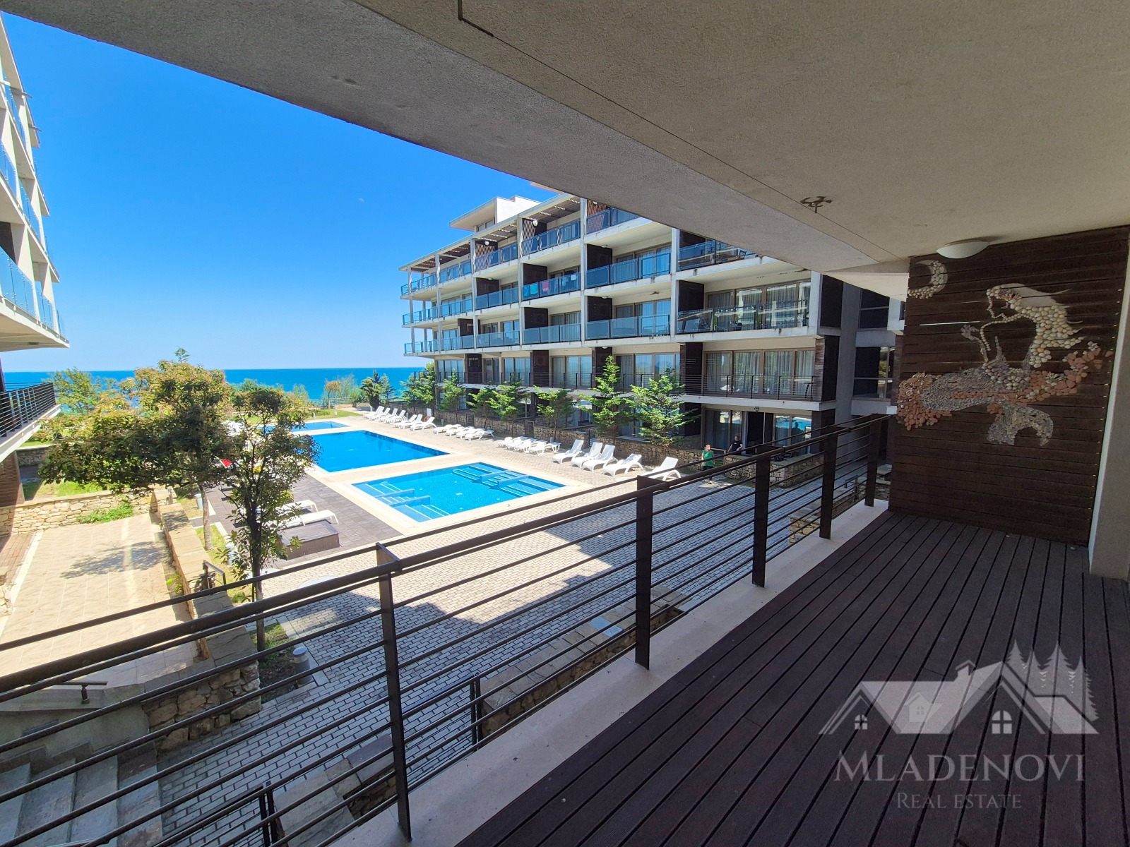 Имаме удоволствието да В предложим за продажба двустаен апартамент с ФРОНТАЛНА ГЛЕДКА МОРЕ в луксозен комплекс на първа линия на морския бряг. Ваканционният комплекс Yoo е от затворен тип в крайбрежната зона на гр. Обзор, сред обширен парк, потънал в зеленина, с широка морска панорама. На територията на комплекса са изградени 4 басейна, детски басейн, детски площадки, тенис-кортове, фитнес-център и СПА-център, магазини, кафенета, барове и ресторанти. Достъпът до плажа е лесен и удобен. Имотът се намира на втори жилищен етаж и се състои от просторна всекидневна с кухненски кът с уникална гледка към морето, спалня, голяма чудесно поддържана тераса, обща за двете стаи и голяма баня и тоалетна. Стаите са с великолепни френски прозорци, от които се открива красива гледка към морето и впечатляващи зелени площи. Продава се с наличното обзавеждане и оборудване. Към имота има и избено помещение с площ от 4кв.м. Агенцията съдейства за отпускане на ипотечен кредит за финансиране покупката на този имот, както и безплатно юридическо обслужване през целия процес на сделката.