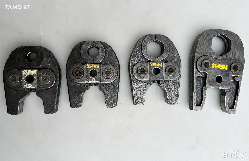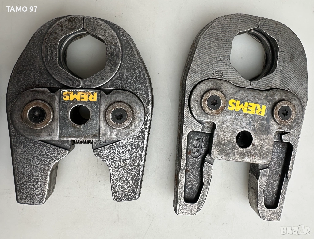 Продавам комплект от прес челюсти за мини преса, челюстите са на марката Ремс, оригинално немско производство внос от Франция. Пресовъчни клещи с обхват ф15; ф18; ф28; ф35; с обозначение V. Клещите за кримпване на фитинги на REMS са изработени от специално закалена стомана и са в много добро състояние. При кримпването с тези клещи се осигурява много прецизна обработка. За всички разпространени пресфитингови системи. Обявената цена е за всичко от снимките. Пращаме с опция преглед и тест с куриерска фирма еконт може и лично предаване за гр. Шумен.