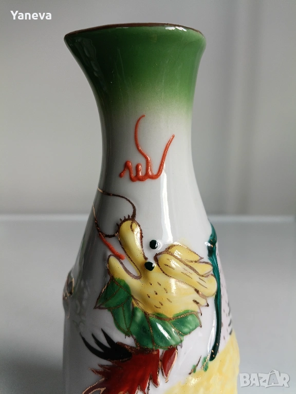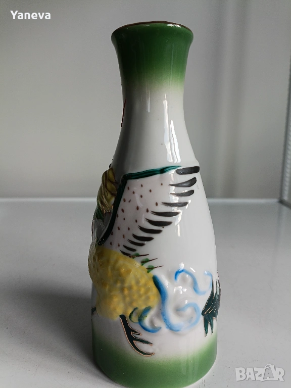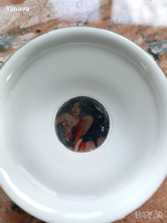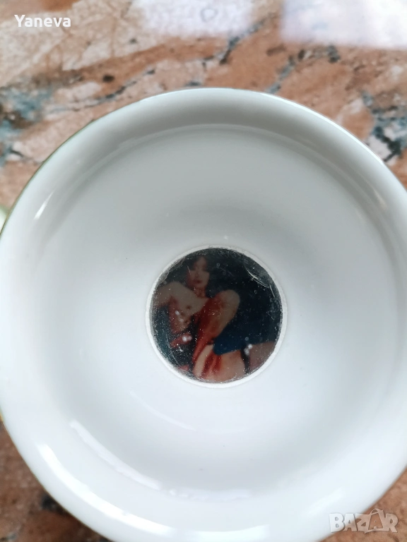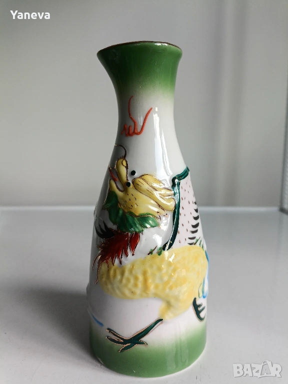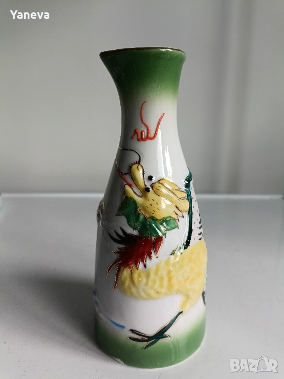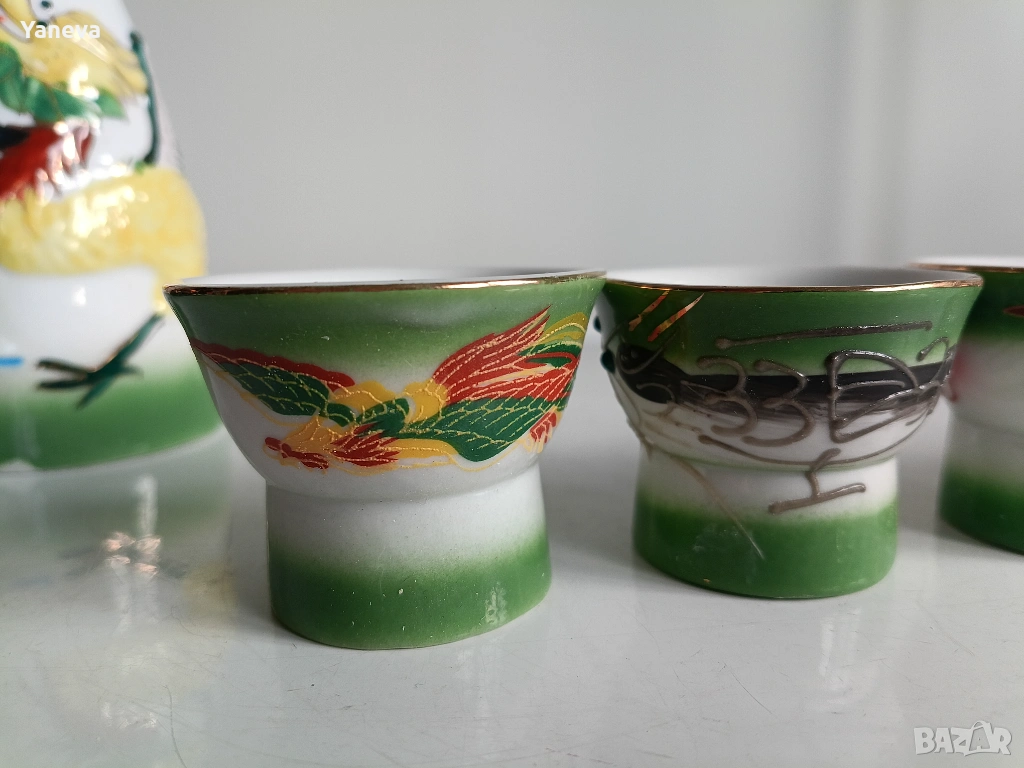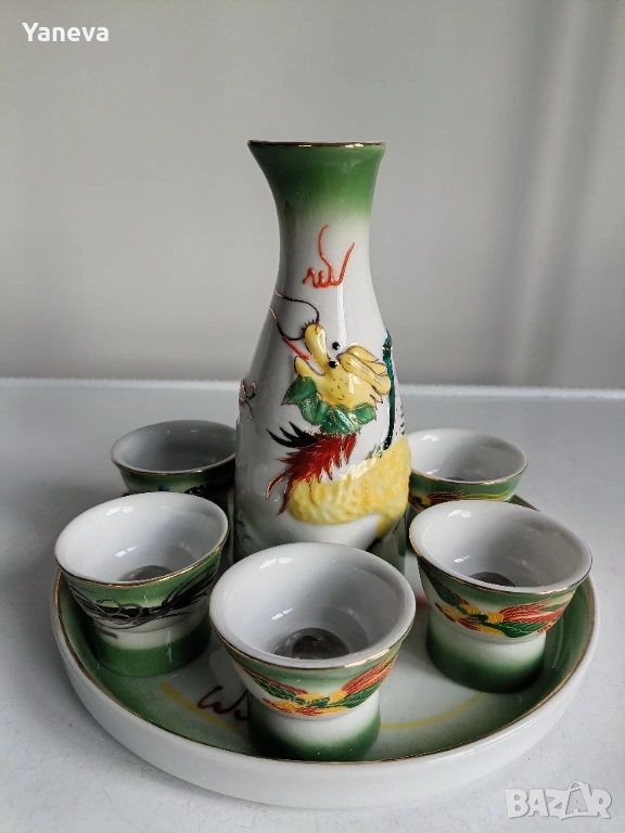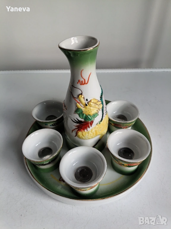 Порцеланов , китайски комплект за ракия с декорация от дракони. След наливане на питие, на дъното се появяват Адам и Ева. Цена 60 евро