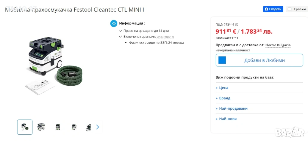 Продавам професионална мобилна прахосмукачка на Festool в перфектно техническо състояние с леки козметични забележки. Прахосмукачката работи и функционира перфектно, оригинално немско производство внос от Франция. Обявената цена включва прахосмукачката с оригинален маркуч, торба на Festool, приставки и куфар на Festool. Единствената забележка е отбелязана на предпоследната снимка оградено с червено. Пращаме с опция преглед и тест с куриерска фирма еконт може и лично за гр. Шумен.